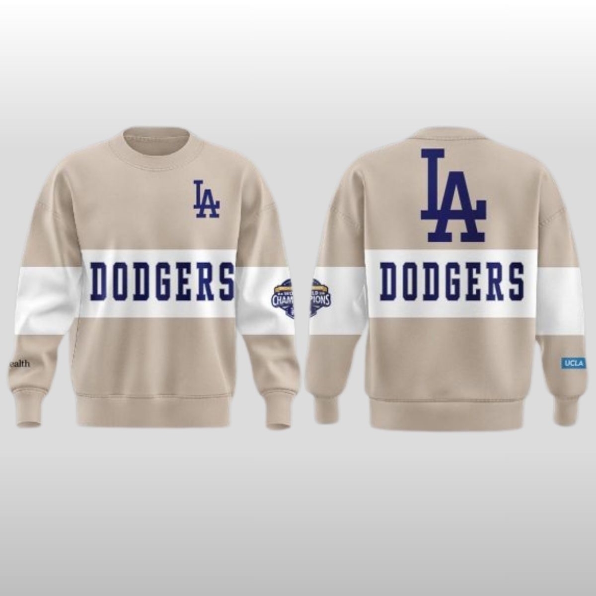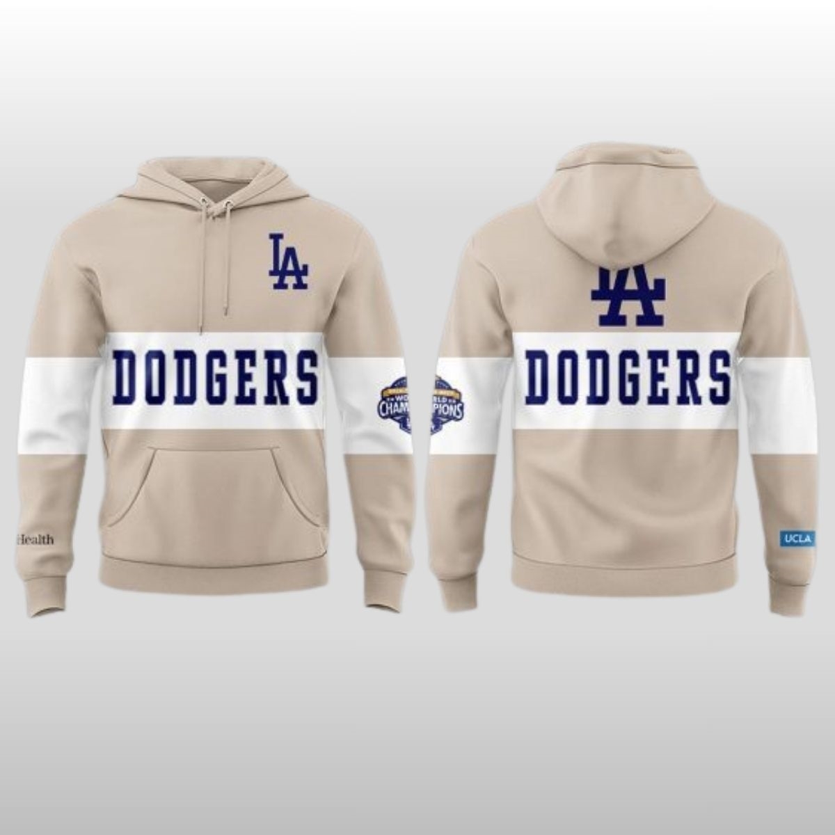 The design of this hoodie is a masterclass in balanced aesthetics, moving away from standard block colors to embrace a sophisticated three-toned palette. The main body is bathed in a warm, sandy beige that serves as a neutral canvas for the bold details. A striking horizontal white band wraps around the chest and sleeves, housing the “DODGERS” wordmark in a heavy, navy blue block font that commands attention. To add a touch of classic flair, the iconic interlocking “LA” logo is placed delicately on the upper left chest, mirrored by a larger, prominent version on the back. This layout ensures that whether you are cheering from the front row or walking through the concourse, your allegiance is unmistakable.