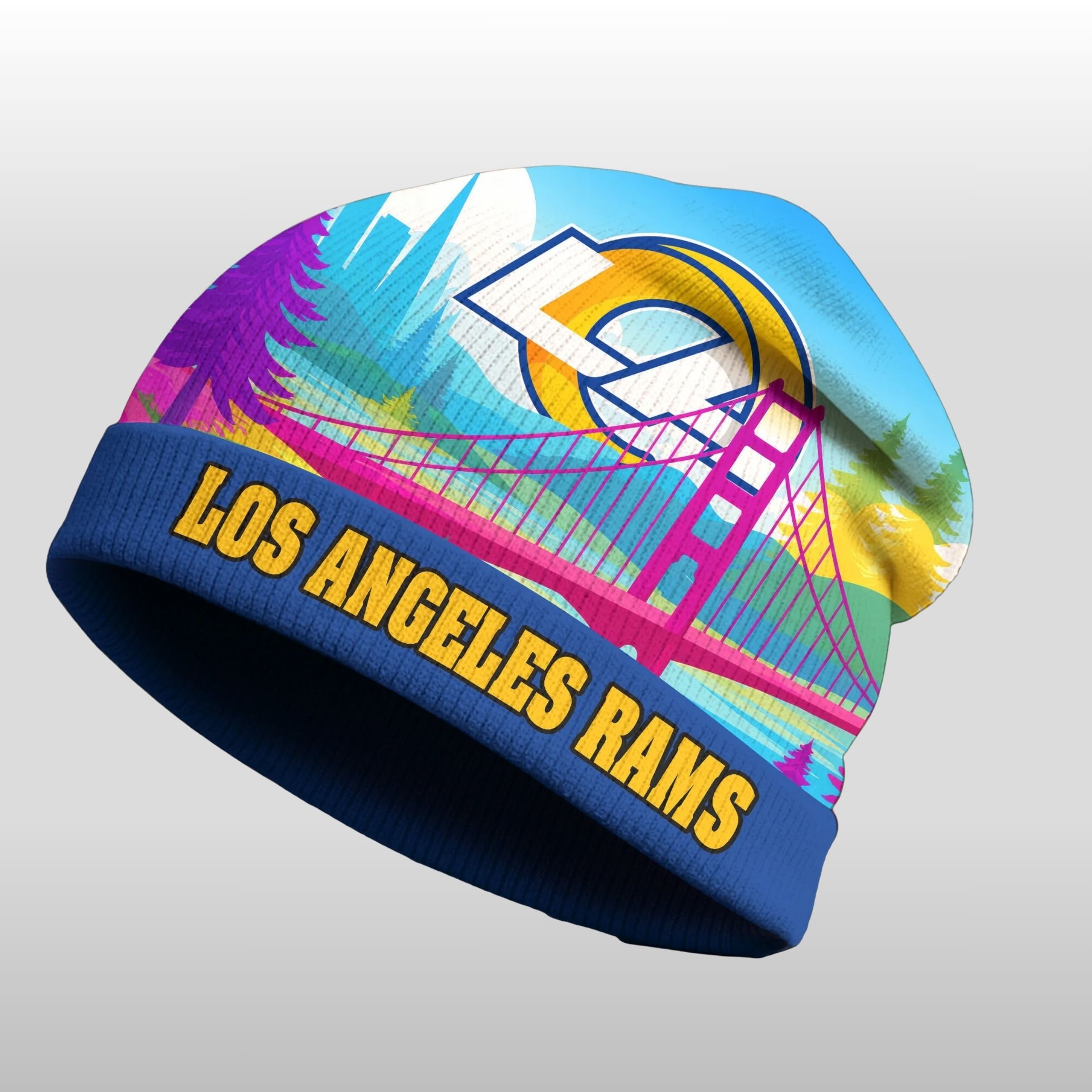 - The Design: A sophisticated fusion of the Los Angeles Rams typography and a psychedelic Bay Area skyline.