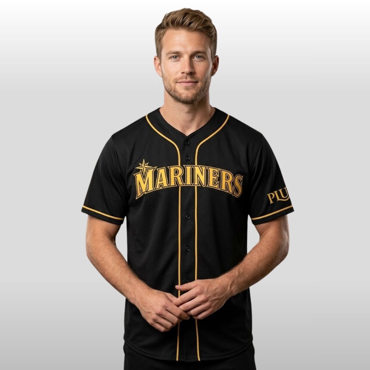 Designed for the 2026 season’s special tribute nights, this jersey features a premium black base that makes the golden accents truly pop. The iconic “MARINERS” wordmark is emblazoned across the chest in a classic serif font, rendered in a rich metallic gold that catches the light whether you’re under the stadium beams or the afternoon sun.