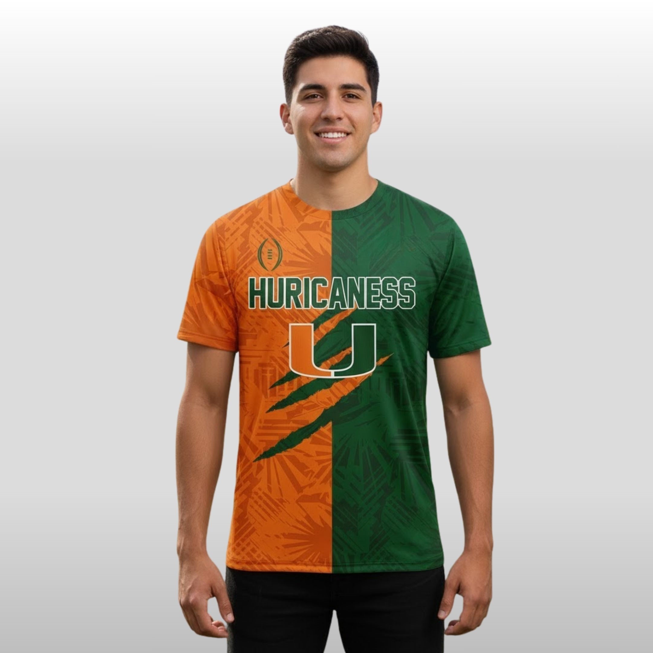 The 2026 season marks a new chapter in Hurricanes football, and this shirt captures the high-energy spirit of Coral Gables. The front of the shirt features a bold, split-color design in iconic orange and forest green, accented by palm leaf patterns that scream Miami. Emblazoned across the chest is the word “HURICANESS” (a nod to the relentless force of nature) paired with the legendary “U” logo over aggressive claw-mark graphics. It’s a visual representation of a team that doesn’t just play—they dominate.