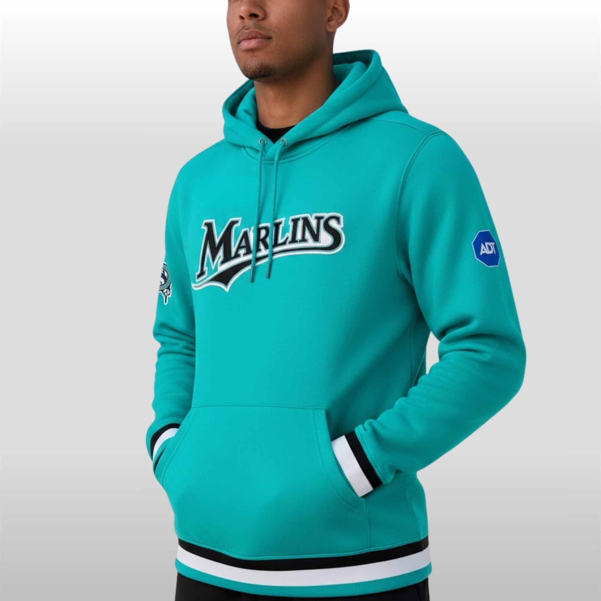 This hoodie is a masterclass in retro-inspired design. It breaks away from the modern primary colors to fully embrace the iconic teal that defined an entire era of Miami greatness. The front features the classic “MARLINS” script, rendered in a sharp black-and-white outline that pops vividly against the electric teal base. It’s a design choice that pays homage to the roots of the franchise while providing a fresh, cozy alternative for fans today.