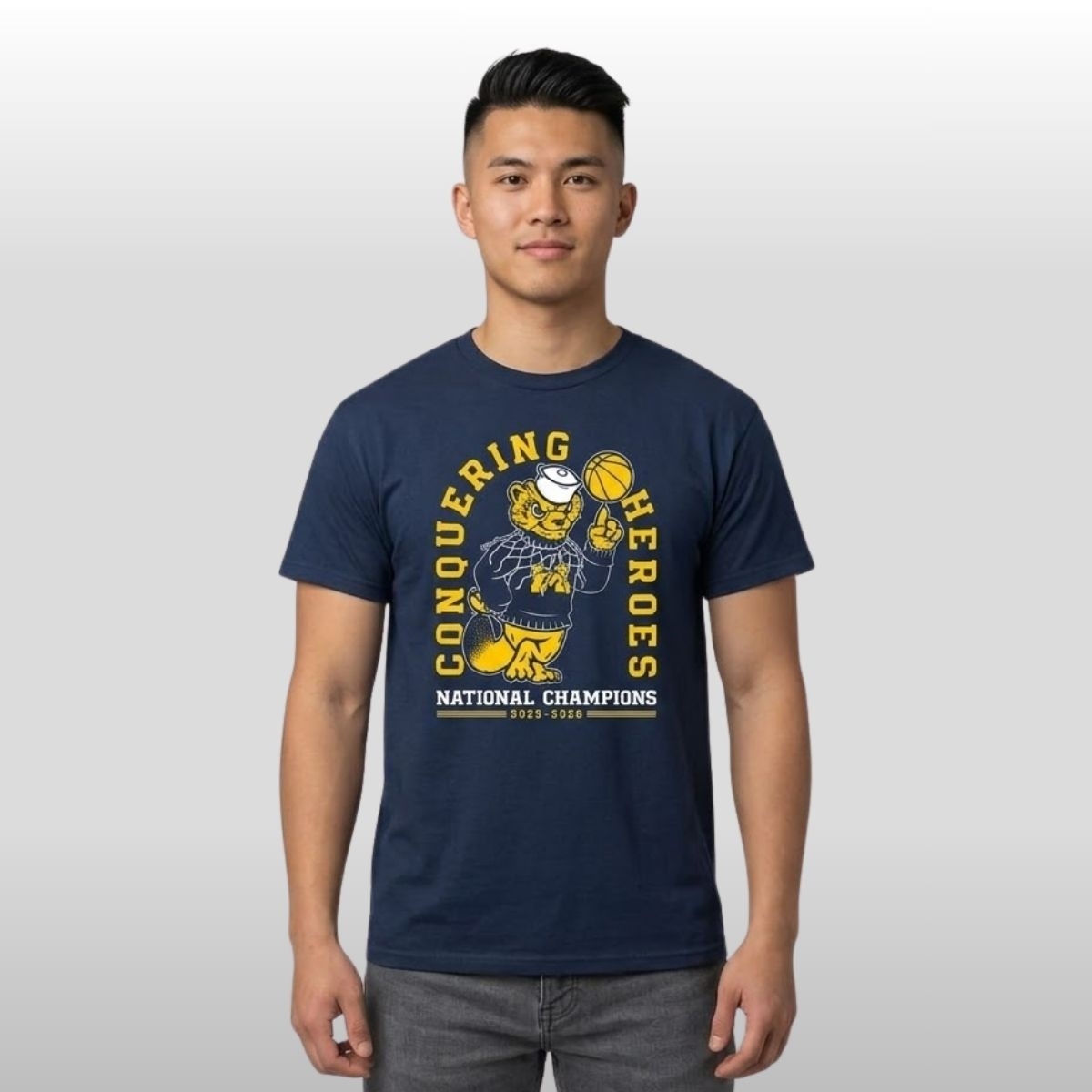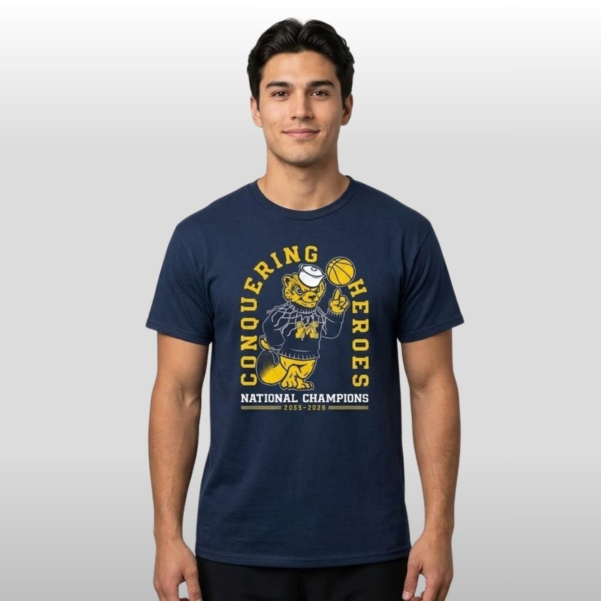 The 2026 Michigan Wolverines Basketball Conquering Heroes National Champions Shirt is the ultimate tribute to a season defined by grit and glory. Featuring the iconic “Conquering Heroes” lyrics paired with a vintage-inspired wolverine mascot spinning a basketball, this navy blue tee perfectly captures the spirit of Ann Arbor. The bold maize lettering stands out against the deep fabric, making it a timeless piece of memorabilia for those who want to carry the thrill of the win wherever they go.