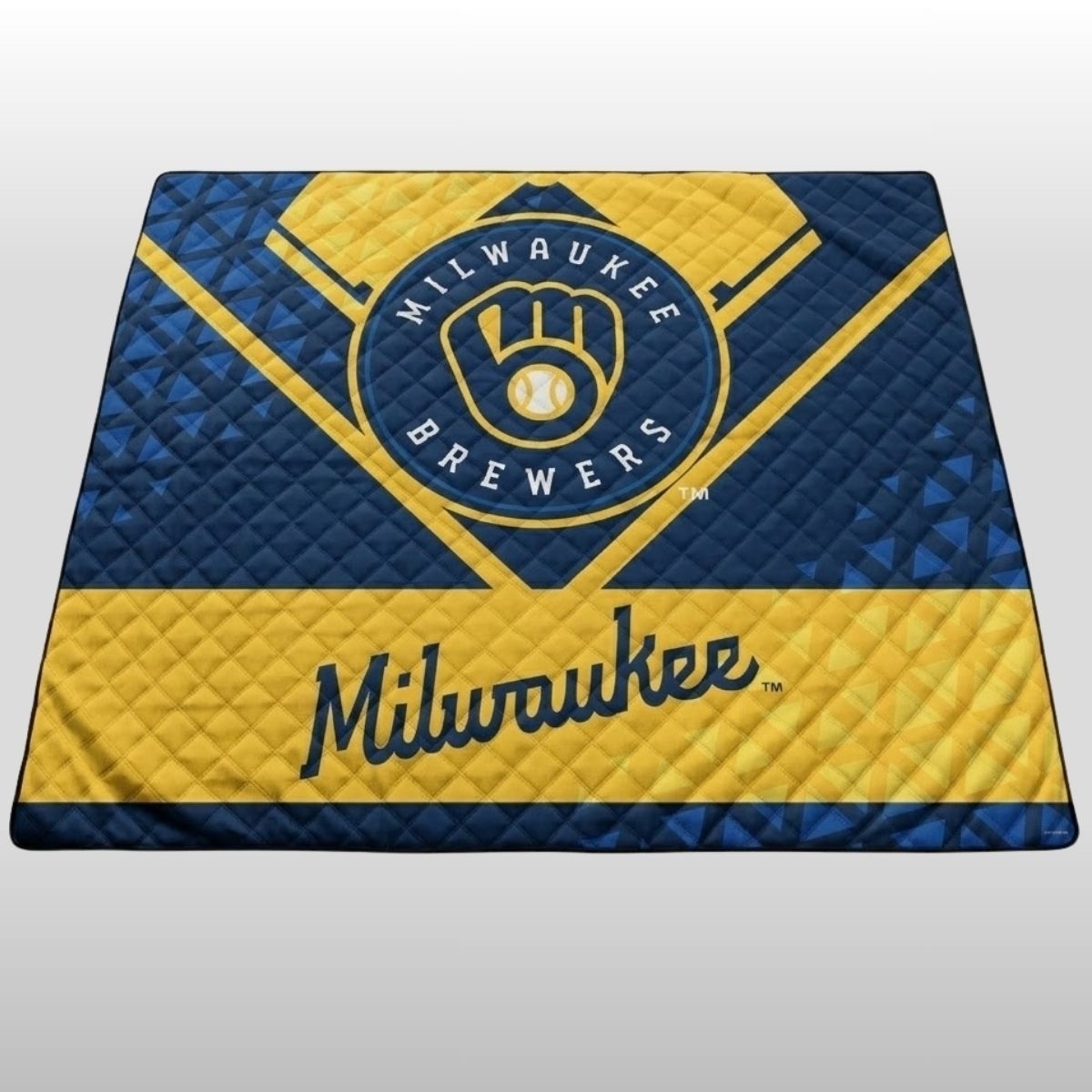 The design of this year’s commemorative blanket is a striking departure from standard stadium gear. It features a quilted, diamond-stitch pattern that provides both durability and a premium feel. The centerpiece is a large circular crest housing the iconic “ball-in-glove” logo, surrounded by the bold text “MILWAUKEE BREWERS” in a clean, sans-serif white font against a deep navy blue background. Below the central emblem, the “Milwaukee” script flows elegantly in a cursive, navy blue typeface across a vibrant gold stripe. Flanking the center are modern, geometric patterns of blue and gold triangles, creating a dynamic visual that feels both contemporary and nostalgic.
