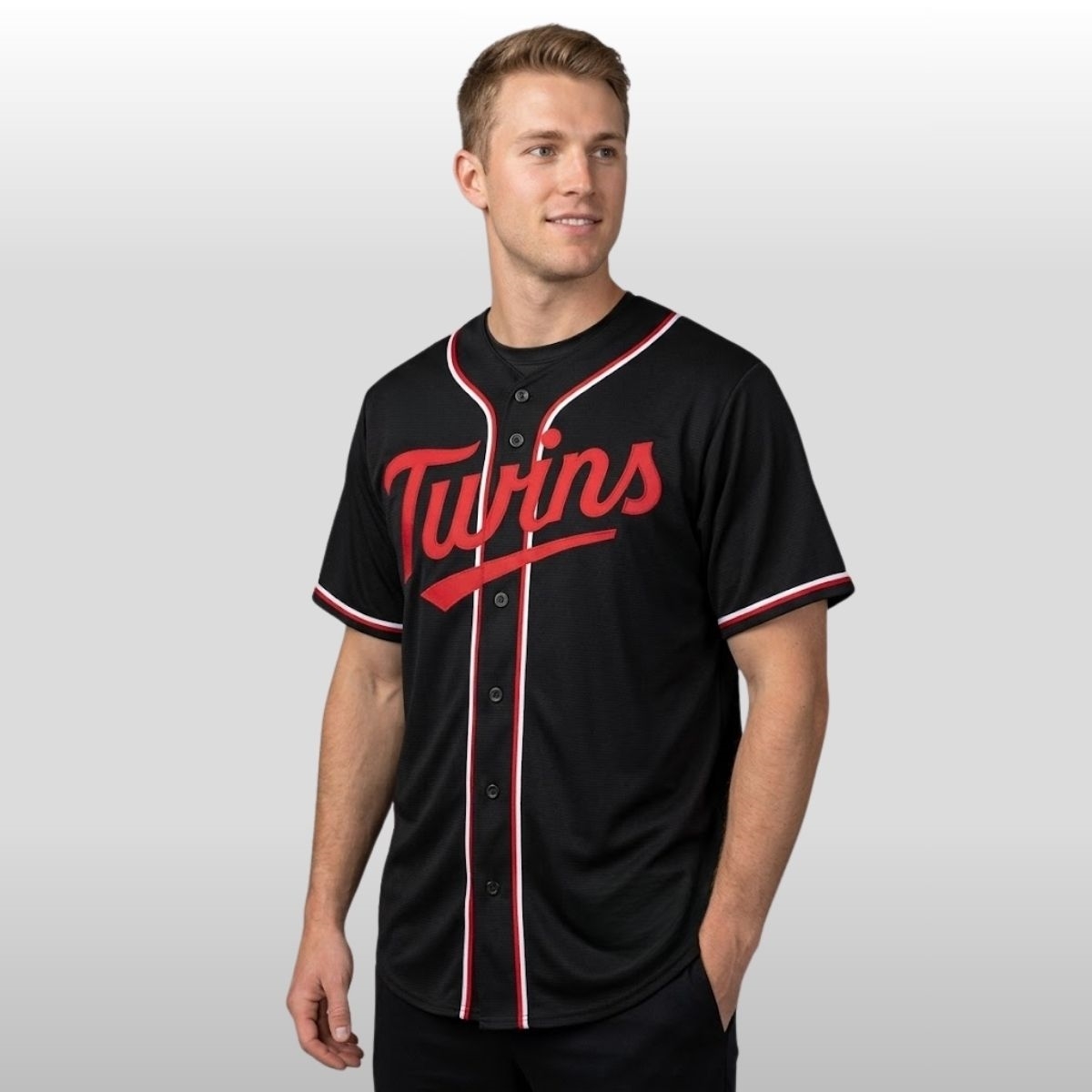 Looking for a piece that anchors your wardrobe in bold, midnight tones? The 2026 Minnesota Twins Fashion Black Out Jersey is a masterclass in modern sports aesthetics. This specific edition features the iconic “Twins” script across the chest, rendered in a deep, vibrant crimson that pops against the matte black fabric. The lettering is meticulously applied with a sleek underline that gives the design a sense of forward motion. To celebrate the team’s connection to the Twin Cities, this jersey was the centerpiece of the “Lights Out” community event held at Target Field, where the stadium lights were dimmed to showcase the reflective piping along the sleeves and placket.