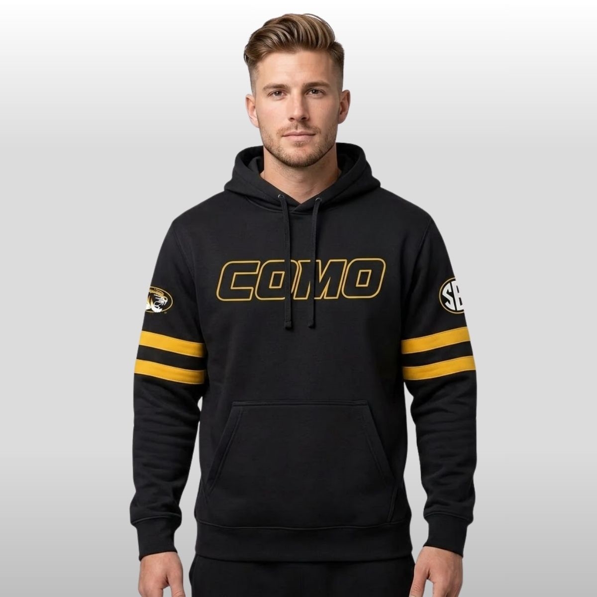 The 2026 Mizzou Tigers x COMO Day Uniform Hoodie is a striking tribute to the heart of Columbia, Missouri. This garment features a bold “COMO” across the chest in golden-yellow block lettering, outlined to pop against the sleek black fabric. The sleeves are accented with vibrant dual stripes and the iconic tiger head logo, creating a look that is both athletic and sophisticated. On the back, a detailed architectural graphic showcases the historic Jesse Hall beneath a stylized map of Missouri, celebrating the deep roots and academic heritage of the university. This piece is designed for the annual COMO Day celebrations, an event where the local community and students unite to honor the unique culture of their college town.