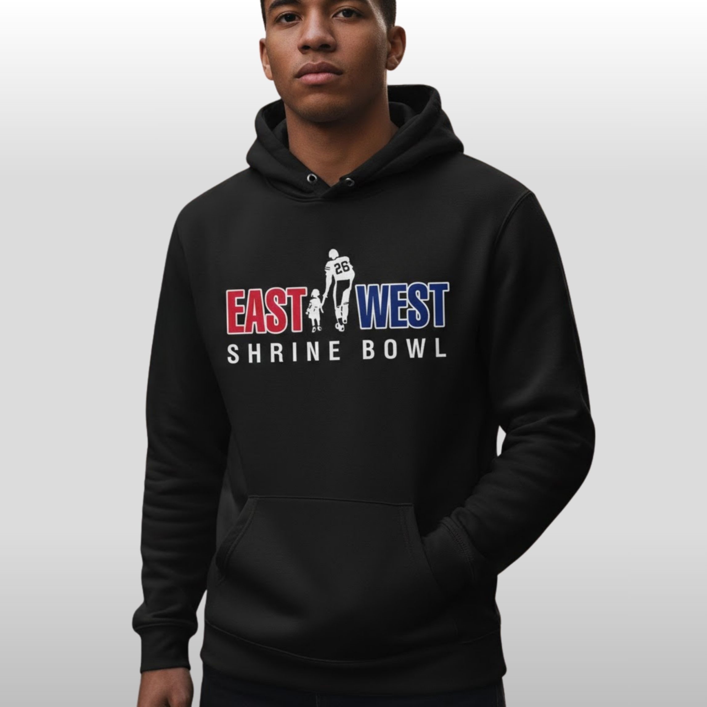 The design of this hoodie is a masterclass in clean, impactful aesthetics. Stepping away from standard collegiate wear, it features a sleek midnight black base that allows the vibrant graphics to command attention. The front showcases the “EAST WEST SHRINE BOWL” typography in a striking red and blue gradient, flanking a silhouette of a player and child—a nod to the event’s philanthropic roots.