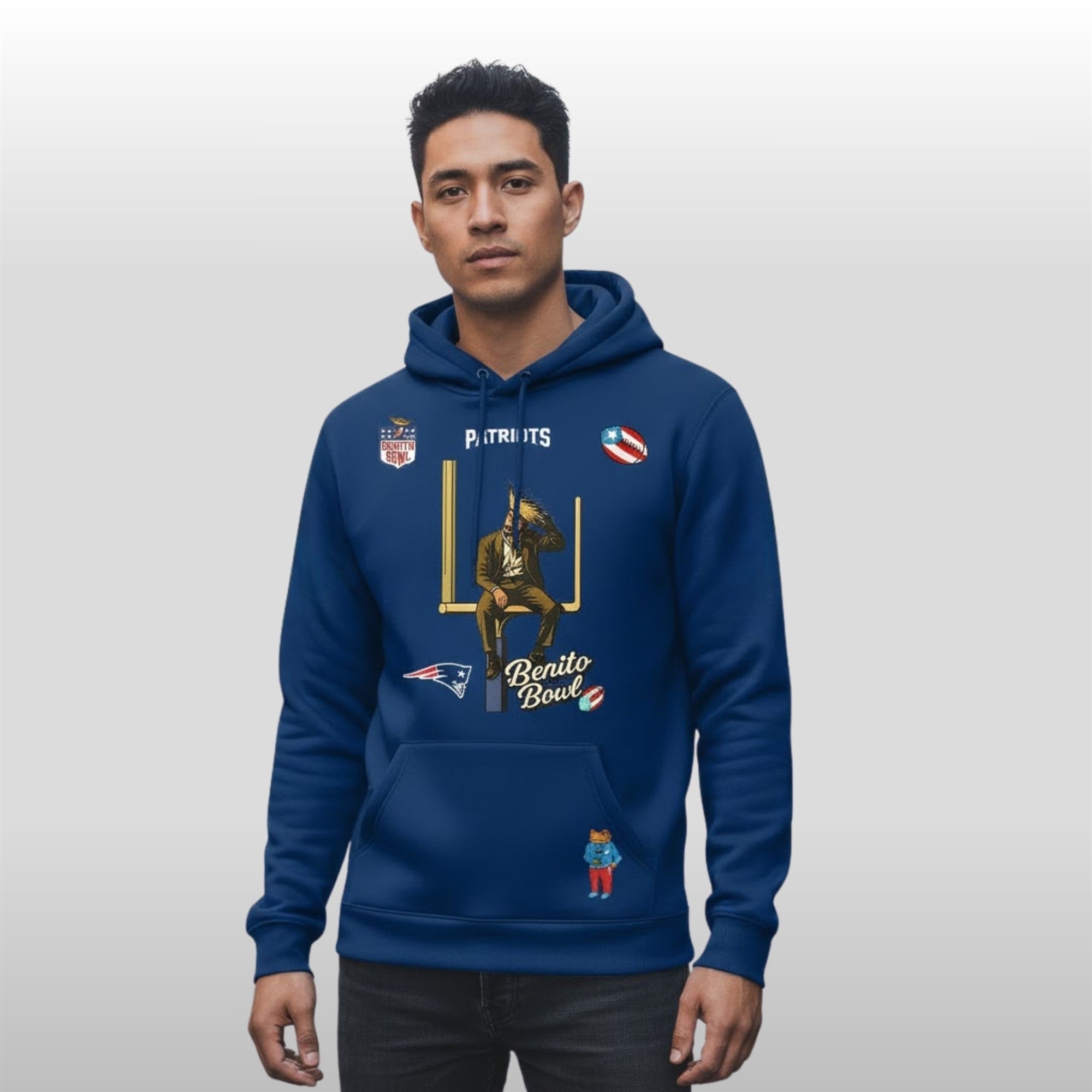 This piece is a masterclass in aesthetic storytelling. Moving beyond standard game-day gear, the hoodie features a deep navy base that serves as a canvas for a “Benito Bowl” inspired transformation. The front showcases a stylized graphic of Bad Bunny himself perched atop a goalpost, blending the “King of Latin Trap” persona with classic New England imagery. The inclusion of Puerto Rican flag accents and the signature “El Conejo Malo” bunny ears on the reverse creates a vibrant, multi-cultural look that feels more like high-end streetwear than a standard fan souvenir.