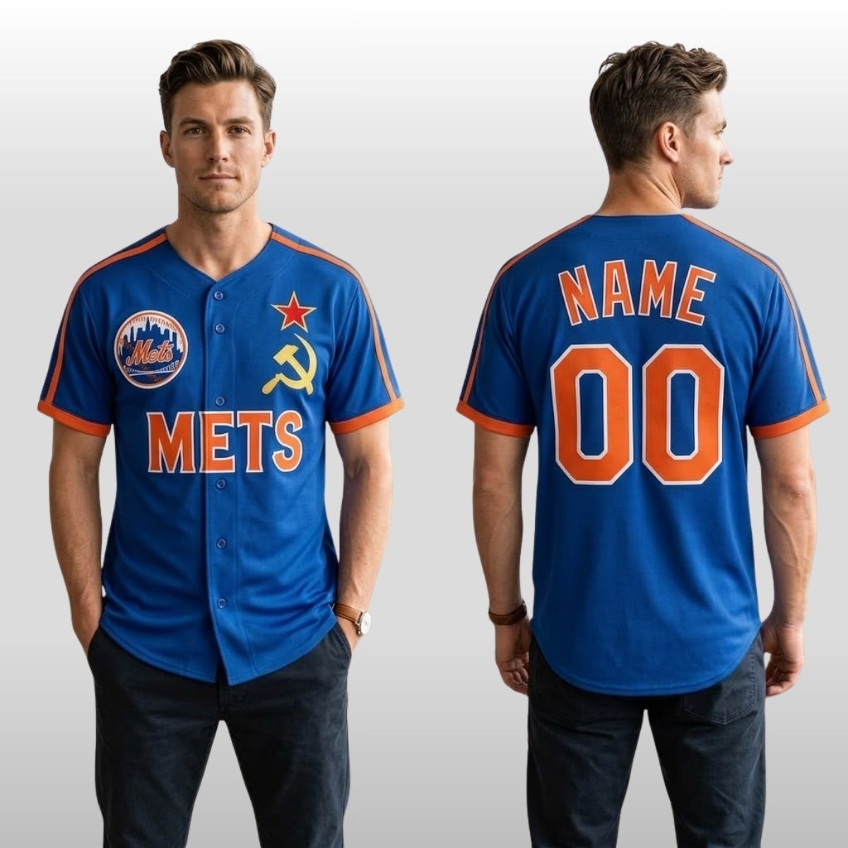 The 2026 New York Mets Sickle & Hammer City Connect Jersey has arrived as one of the most provocative and discussed apparel releases in recent memory. Merging the traditional blue and orange colorway of Queens with bold, alternative political iconography, this garment transforms a standard sports aesthetic into a high-concept fashion statement. The front of the jersey features the classic skyline circular patch on the right chest, while the left chest prominently displays a bright yellow sickle and hammer topped with a red-outlined star. Below the buttons, the word “METS” is block-lettered in vibrant orange with a white stroke, creating a striking contrast against the royal blue base. This release aligns with a fictional “Alternative History” stadium night, inviting fans to explore a “what if” scenario where the borough’s grit meets radical mid-century symbolism.