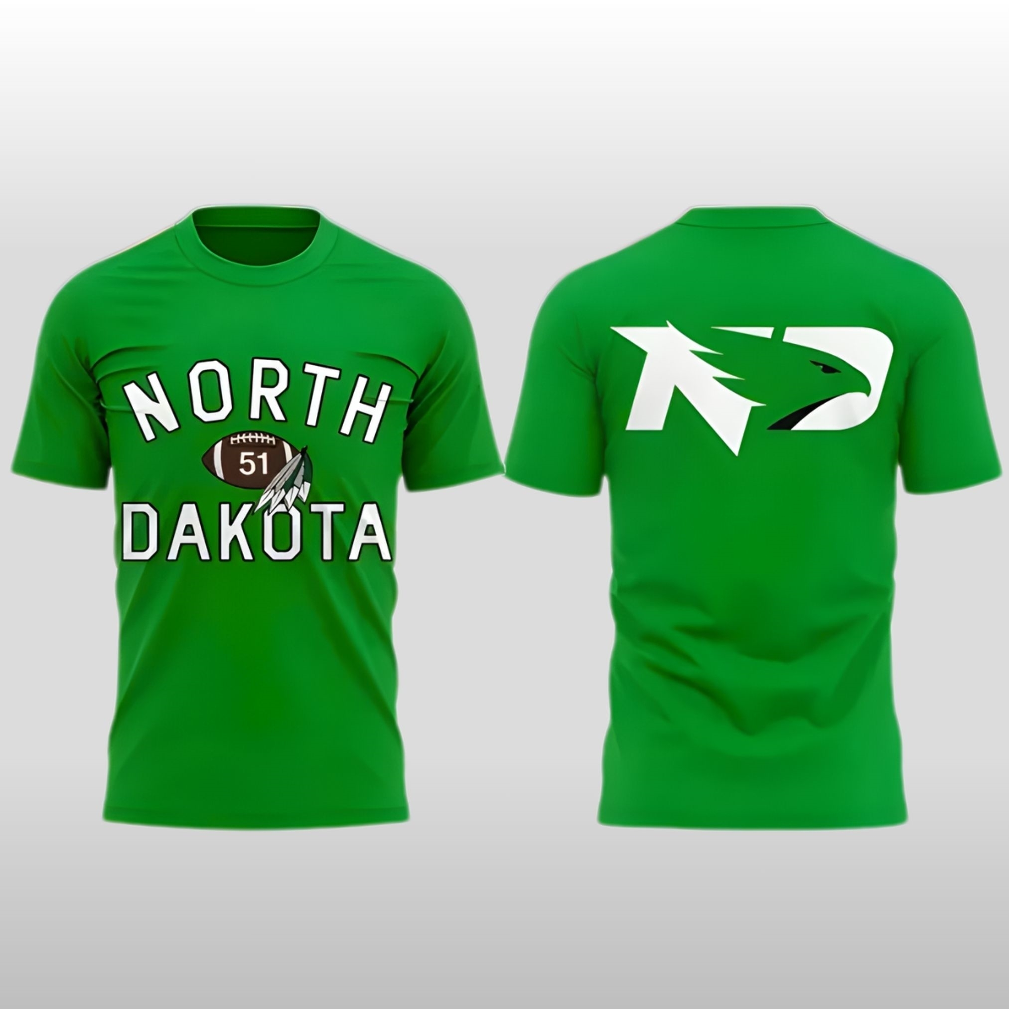 This North Dakota Eric Schmidt commemorative shirt features a vibrant Kelly Green base that pops in any crowd. The front showcases a bold, arched “NORTH DAKOTA” wordmark in crisp white, centered around a classic football graphic branded with the number “51.” Adding a touch of heritage, the design incorporates traditional feather imagery. On the back, a massive, stylized hawk logo stretches across the shoulders, symbolizing the sharp focus and strength of the team.