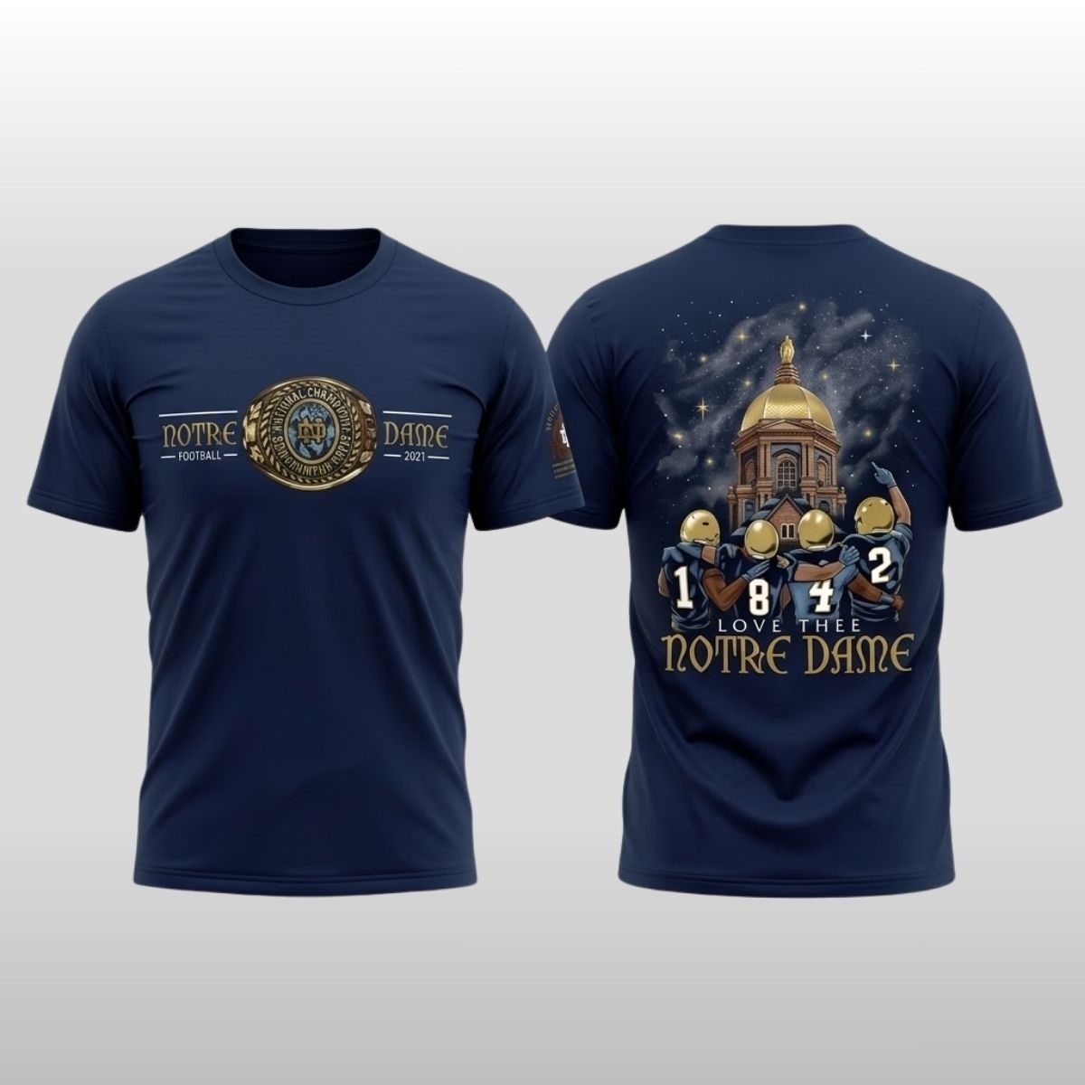 Experience the spirit of South Bend with the 2026 Notre Dame The Shirt. This commemorative piece captures the essence of a storied tradition, featuring a deep navy blue fabric that serves as the perfect backdrop for its intricate gold detailing. The front is anchored by a massive, ornate championship ring graphic centered between the classic “Notre Dame Football” text and the “2026” season marker. On the reverse, the shirt displays an emotional illustration of four players in golden helmets looking toward the iconic Golden Dome under a starry sky, accompanied by the soulful lyrics “Love Thee Notre Dame.” This design honors the unbreakable bond between the team and its devoted community during the season’s most pivotal matchups.