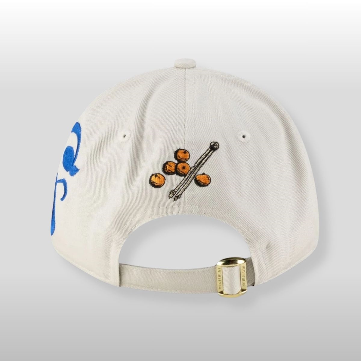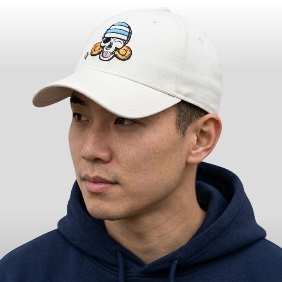 The design is centered on a unique interpretation of the iconic Jolly Roger. Instead of the standard crossbones, this piece features a stylized skull adorned with Nami’s signature blue-and-white striped bandana. The playful addition of orange citrus accents—a nod to her beloved tangerine trees—adds a pop of vibrant color that breaks through the neutral cream canvas. The embroidery is thick and tactile, ensuring that the details of the wink and the mischievous grin remain sharp and eye-catching from any distance.