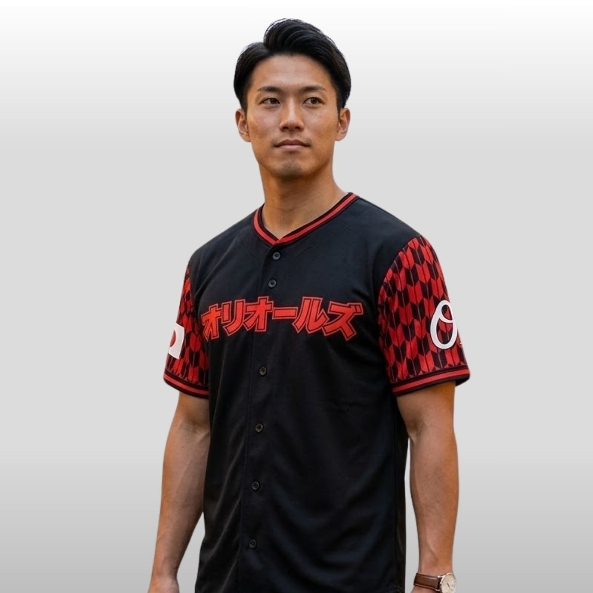 The jersey is a breathtaking departure from standard designs, blending the club’s bold identity with classical Japanese aesthetics. The body features a sleek, deep black canvas that allows the vibrant red accents to take center stage. Across the chest, the word “Orioles” is masterfully rendered in Japanese Katakana script, creating a unique visual that bridges two cultures through a shared love of the sport.