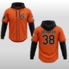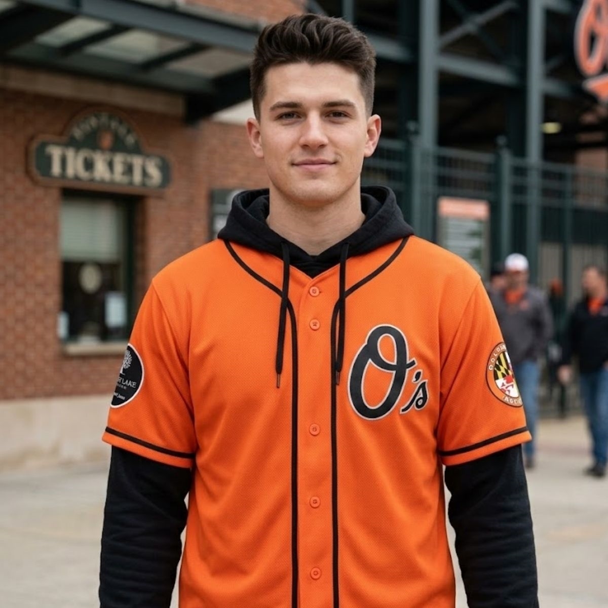 The 2026 Orioles Kyle Bradish Jersey Hoodie is a masterclass in functional fan gear. Moving beyond the standard button-down, this design features a built-in black hoodie layered under a vibrant orange jersey shell. The front is anchored by the classic “O’s” script in bold black and white embroidery, while the sleeves bear specialized patches celebrating Maryland pride.