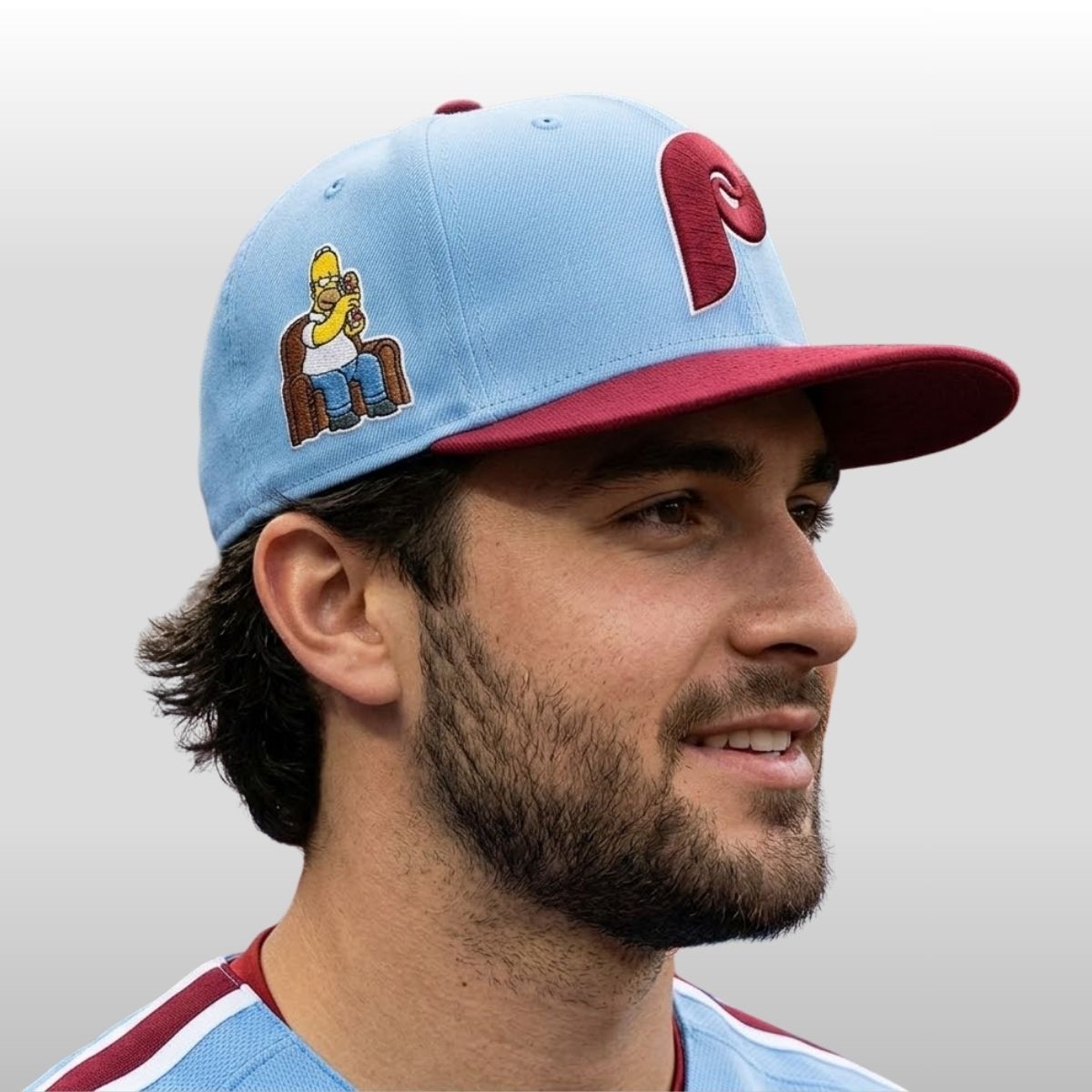 The 2026 Philadelphia Phillies Simpsons Hat is a brilliant collision of two legendary worlds, bringing the animated charm of Springfield to the passionate streets of Philadelphia. This headwear choice swaps traditional sports aesthetics for a playful, nostalgic energy that resonates with fans across generations. The crown features the beloved powder blue colorway, a direct nod to classic team history, while the vibrant maroon brim provides a bold contrast that anchors the design. On the side, a beautifully detailed embroidery of Homer Simpson lounging in his iconic armchair adds a layer of whimsical storytelling. It’s a design that prioritizes character and personality, making it a standout accessory for anyone looking to express their fandom with a sense of humor and a touch of 90s television gold.