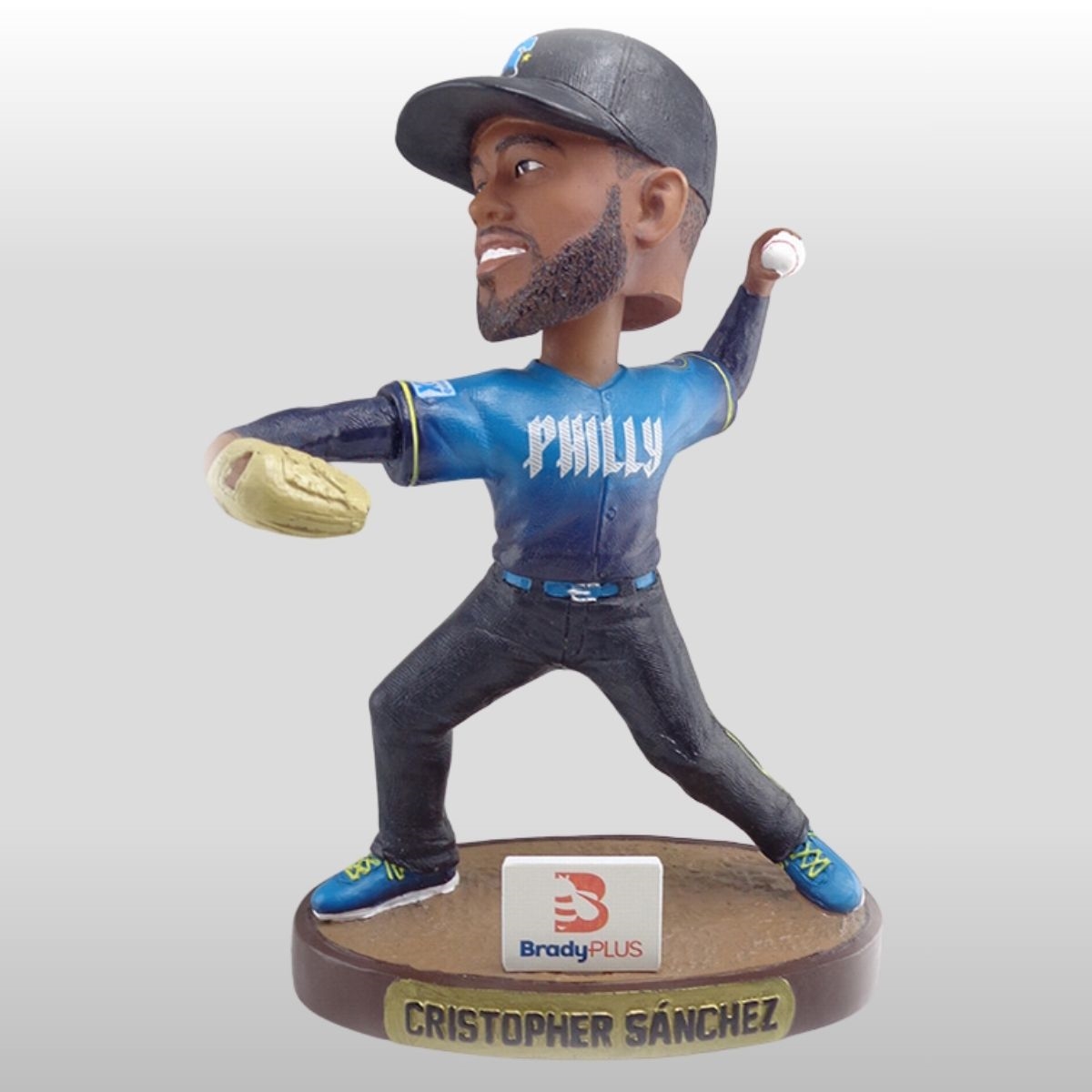 The design of this 2026 Phillies Cristopher Sanchez Bobble Figurine Giveaway focuses on the high-action pitching motion that has become a signature sight for the local faithful. Dressed in a vibrant blue and navy alternate jersey, the figure features “PHILS” emblazoned in bold, crisp white letters across the chest, capturing the modern aesthetic of the team’s City Connect-inspired look. The attention to detail is remarkable, from the focused expression on the face to the sculpted bearded chin, mirroring the player’s game-day intensity. Positioned on a sturdy wood-textured base, the figure holds a miniature baseball mid-windup, ready to deliver a blazing fastball to an imaginary plate.