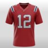 This jersey is a masterclass in aesthetic storytelling. It breaks away from standard game-day looks to embrace a sleek, “Revolutionary Red” base that feels both nostalgic and futuristic. The front features the iconic number 12 in a bold, crisp white font with silver trim, paying homage to the championship legacy that defines the region.