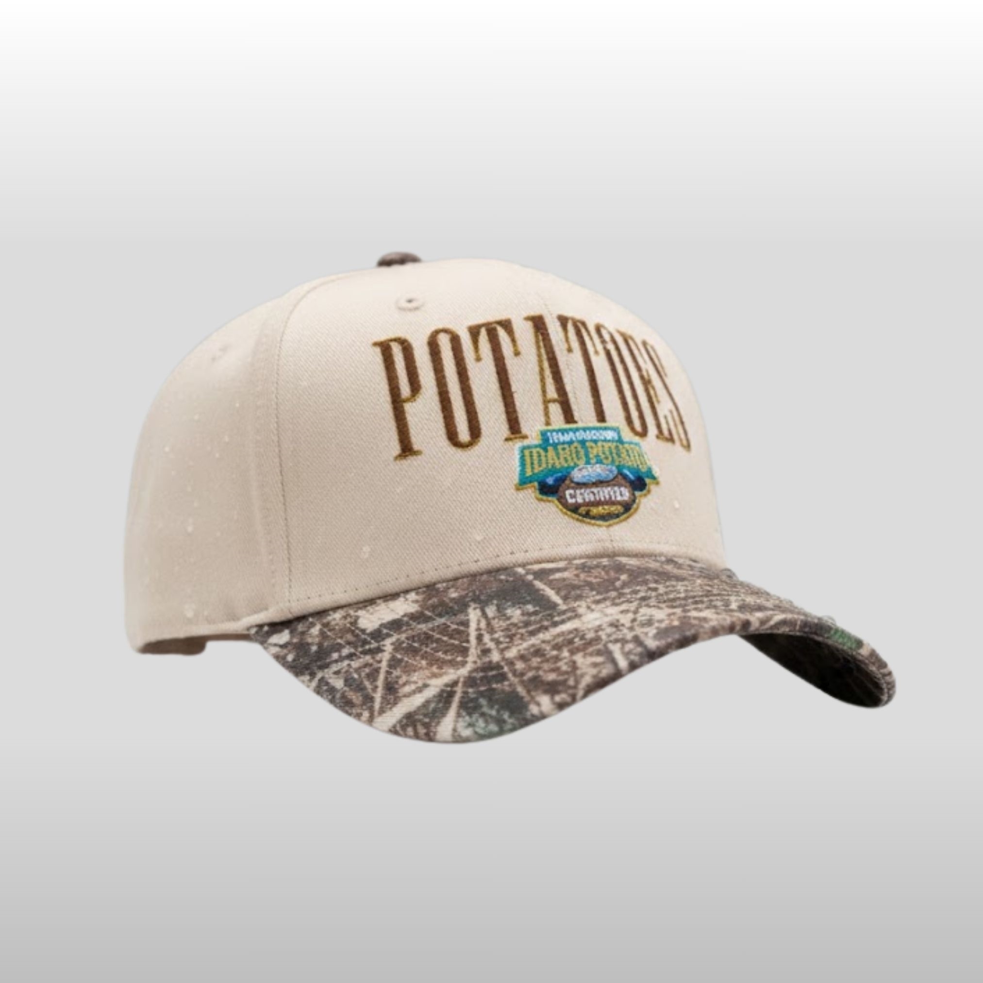 Celebrate a staple of American culture with the 2026 Potatoes Idaho Potato Idaho Potato Hat. This premium cap features a classic cream-colored crown paired with a rugged, woodland-inspired camouflage brim, creating a perfect aesthetic for nature lovers and potato enthusiasts alike. The front is adorned with bold, earth-toned embroidery reading “POTATOES” situated above the iconic “Grown in Idaho” seal, ensuring a high-quality, textured finish that stands out.