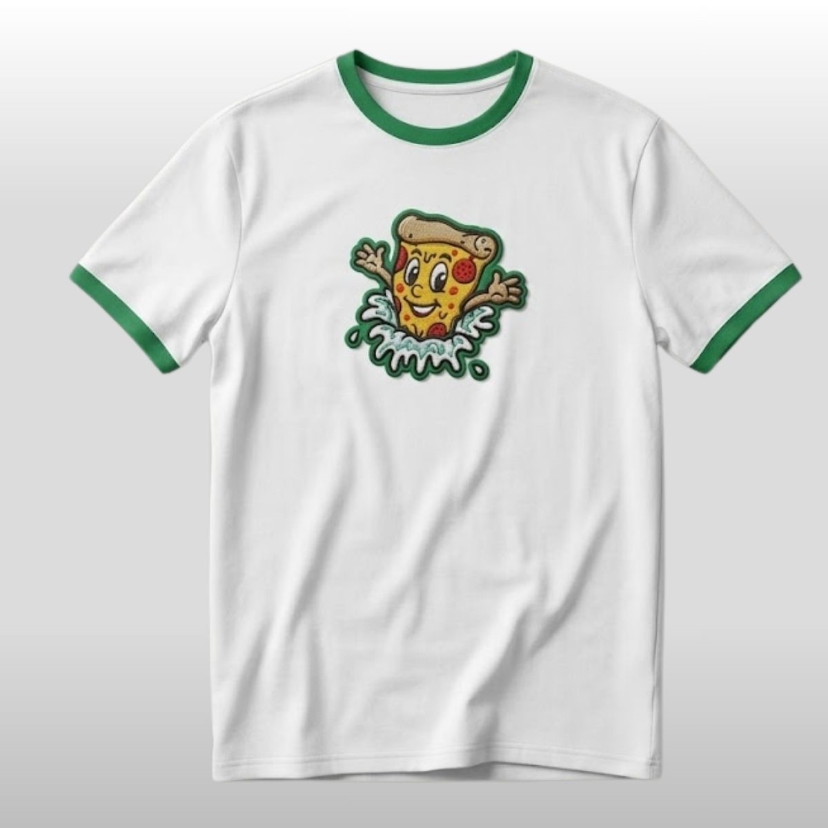 The centerpiece is a high-energy cartoon mascot: a cheerful, animated pizza slice joyfully diving into a splash of creamy ranch dressing. This bold graphic is framed by a deep green outline that makes the artwork pop, creating a visual that is both nostalgic and modern. On the back, the “Ranch Dippers” branding is displayed in a stylized, flowing font that mimics the texture of the sauce, perfectly capturing the lighthearted vibe of a summer night at the stadium.