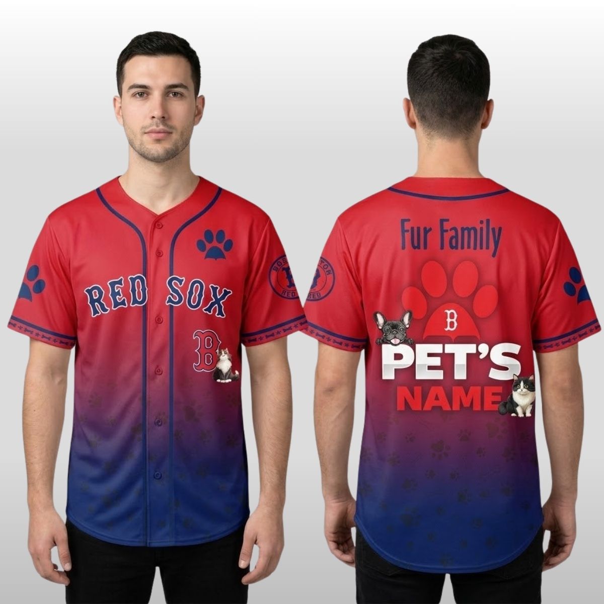 On the reverse, the “Fur Family” spirit takes center stage. A large, bold red paw print sits at the top, featuring a stylized “B” to honor the city’s heritage. Below it, the “PET’S NAME” placeholder invites fans to imagine their own furry MVP’s name across their back. The inclusion of various dog and cat breeds scattered throughout the gradient ensures that every type of pet parent feels represented in this unique community look.