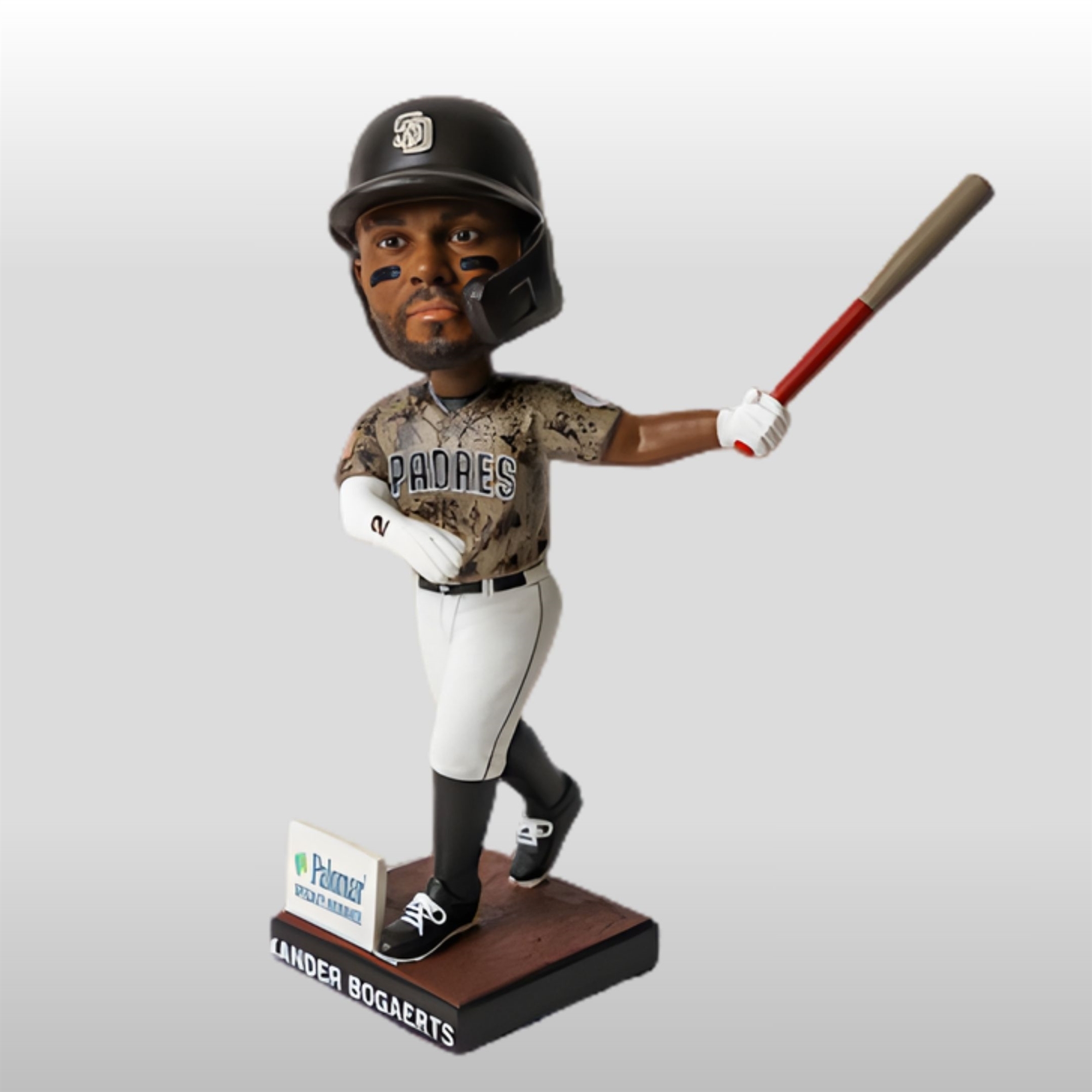 The bobblehead makes an immediate visual statement. It features Xander in a powerful follow-through pose, bat extended, showcasing the “Bogey Goes Boom” moment that fans have come to love. Dressed in the iconic brown and gold camo aesthetic that honors the city’s deep ties to the community, the figure stands atop a wood-textured base. The front plate clearly displays his name, while a miniature replica of the Palomar Health sponsor signage adds a touch of ballpark realism to your shelf.