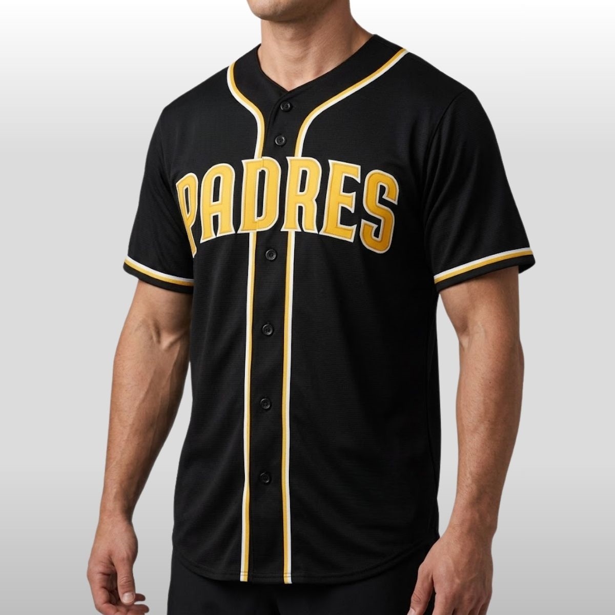 The 2026 San Diego Padres Fashion Black Out Jersey represents a bold shift in fan apparel, moving away from traditional field colors toward a sleek, midnight aesthetic. This specific design features the iconic “PADRES” wordmark arched across the chest in a vibrant athletic gold, outlined with a crisp white border that makes the lettering pop against the deep black fabric. Gold and white piping runs down the placket and encircles the sleeves, creating a structured, architectural look. This release coincides with the team’s latest mid-season fan appreciation events, where the “Black Out” theme has become a staple for evening celebrations at the park.