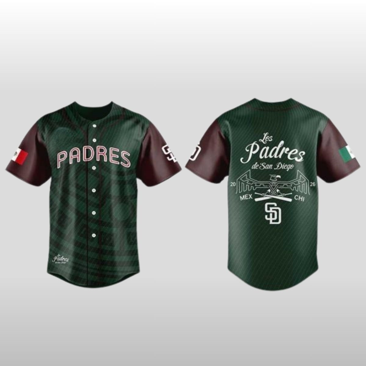 The 2026 San Diego Padres x Mexican Heritage Night Baseball Jersey is a breathtaking fusion of sport and tradition, designed to honor the deep cultural roots that connect the city of San Diego with its neighbors to the south. This year’s edition moves away from traditional color palettes to embrace a sophisticated deep forest green and rich burgundy scheme. The jersey features a subtle, sublimated pattern across the torso that evokes the intricate textures of historical Mexican textiles, creating a visual depth that looks stunning under the stadium lights or in the bright afternoon sun.