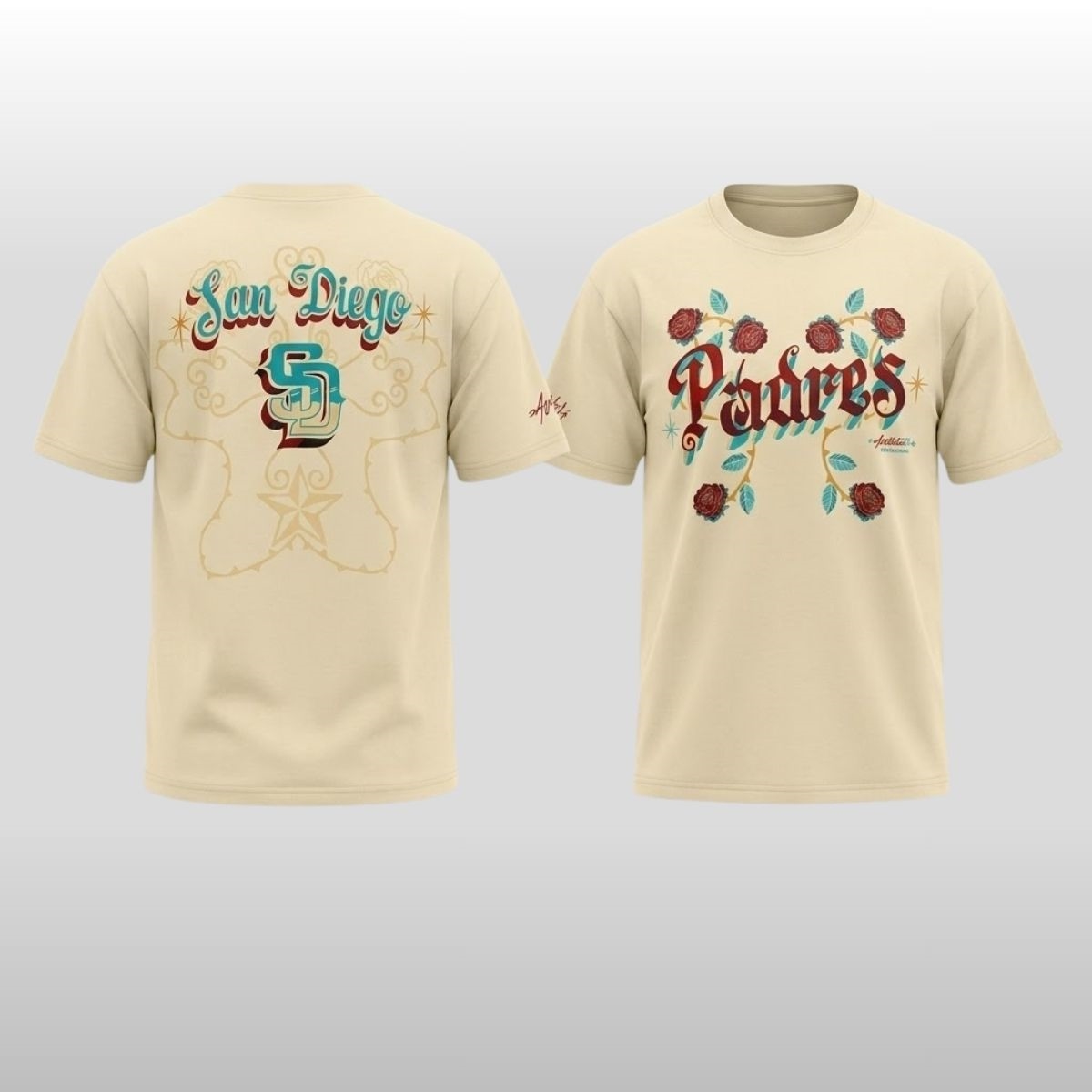 The 2026 San Diego Padres x Rotulos Bautista Shirt is a masterful blend of sports culture and traditional Mexican sign-painting artistry. This shirt features a warm cream base that serves as a canvas for intricate, hand-lettered typography. The front showcases “Padres” in a bold, Gothic-inspired script accented by deep red roses and green vines, while the back displays “San Diego” in a flowing turquoise cursive above the iconic interlocking “SD” logo. This release celebrates the vibrant binational spirit of the region, drawing inspiration from the iconic hand-painted signs (rótulos) seen throughout Southern California and Baja, creating a piece that feels more like a mural than a standard garment.