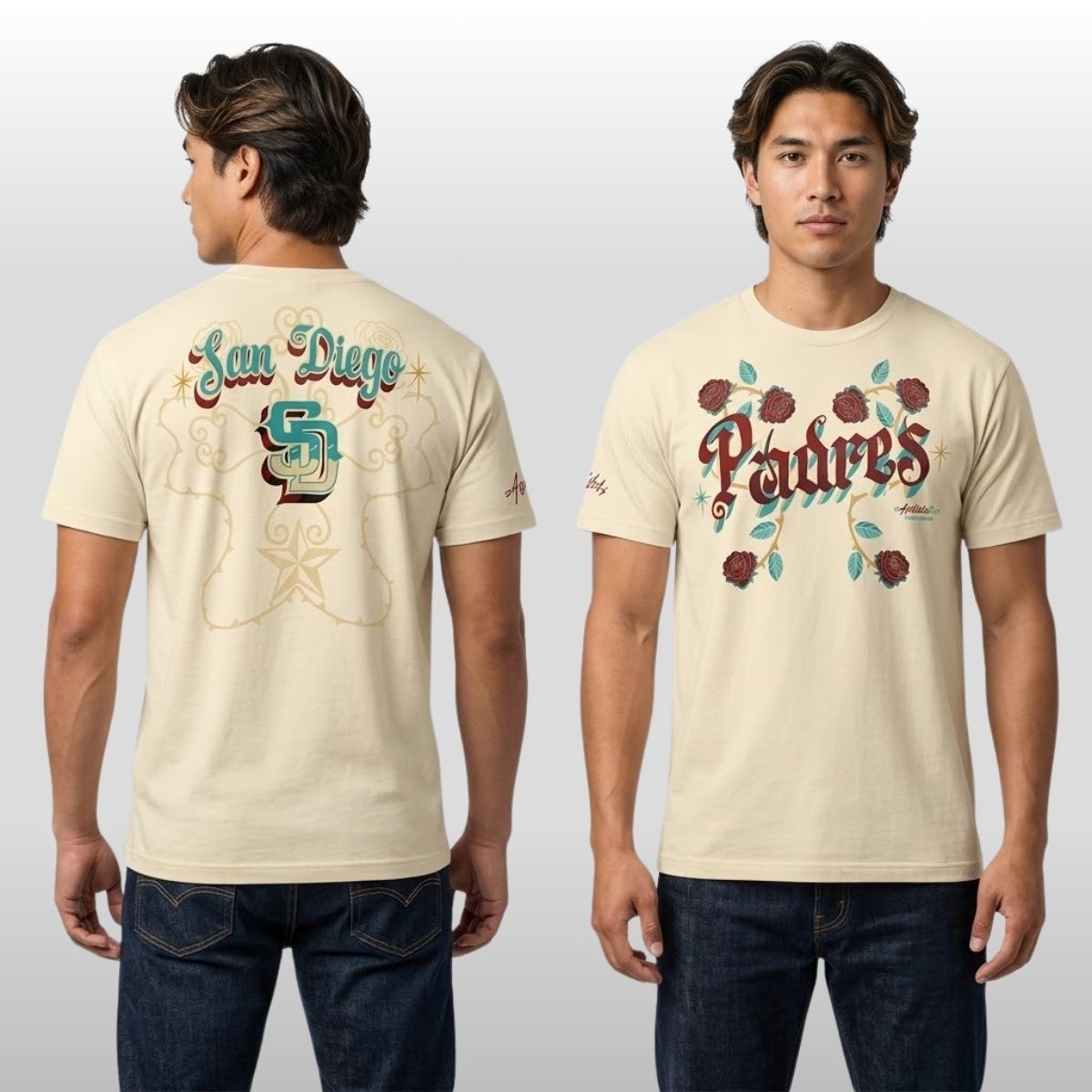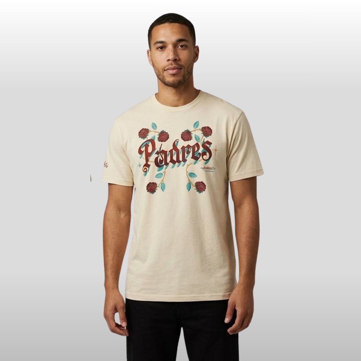 Discover the 2026 San Diego Padres Rotulos Bautista Tee. A premium cream tee featuring hand-painted typography and floral art inspired by San Diego heritage.