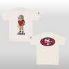 The shirt is a visual tribute to a new age of fan gear. Moving beyond basic logos, the front features a stylized character donning the gold and scarlet, holding a football with the swagger of a world-class performer. The “Concho” vibe is present in every detail—from the playful character design to the clean, minimalist “49ERS” block lettering.