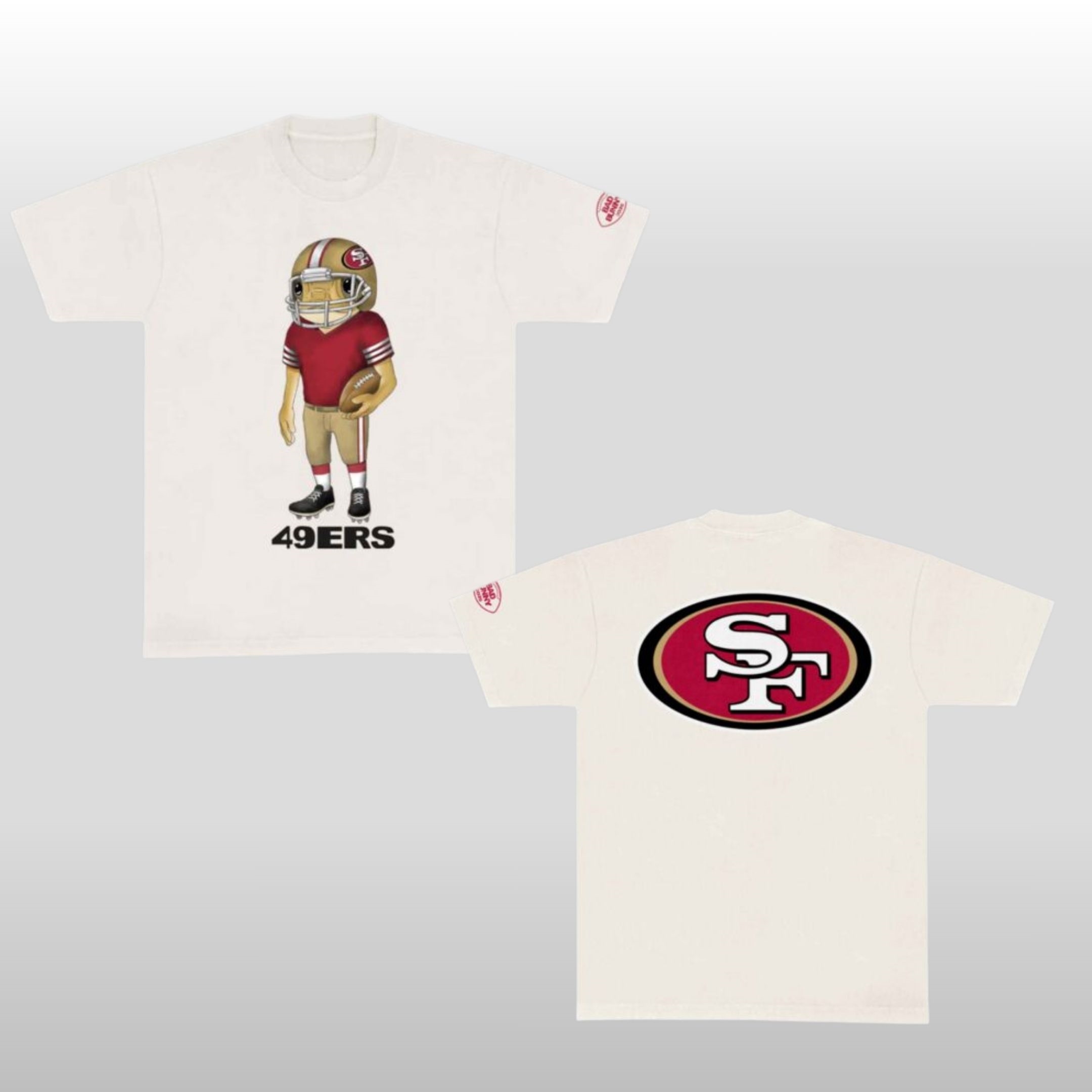 The back keeps it classic yet bold, showcasing the legendary San Francisco oval logo in high-definition print. Adding a touch of exclusivity, the sleeve features a subtle Bad Bunny branding hit, signaling a collaboration that bridges the gap between the stadium and the stage. The off-white, vintage-washed fabric provides a premium “streetwear” feel that looks better with every wear.