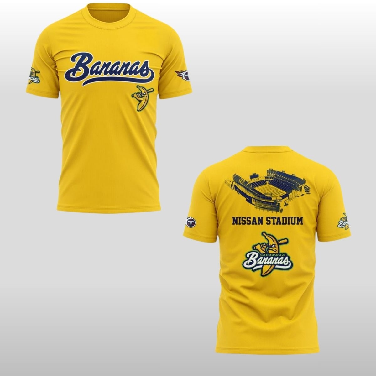 The true highlight is the back design, which pays homage to the legendary Nissan Stadium. A detailed, navy-and-gold architectural sketch of the stadium sits above a custom logo mashup, grounding the whimsical energy of the Bananas in the heart of Nashville.