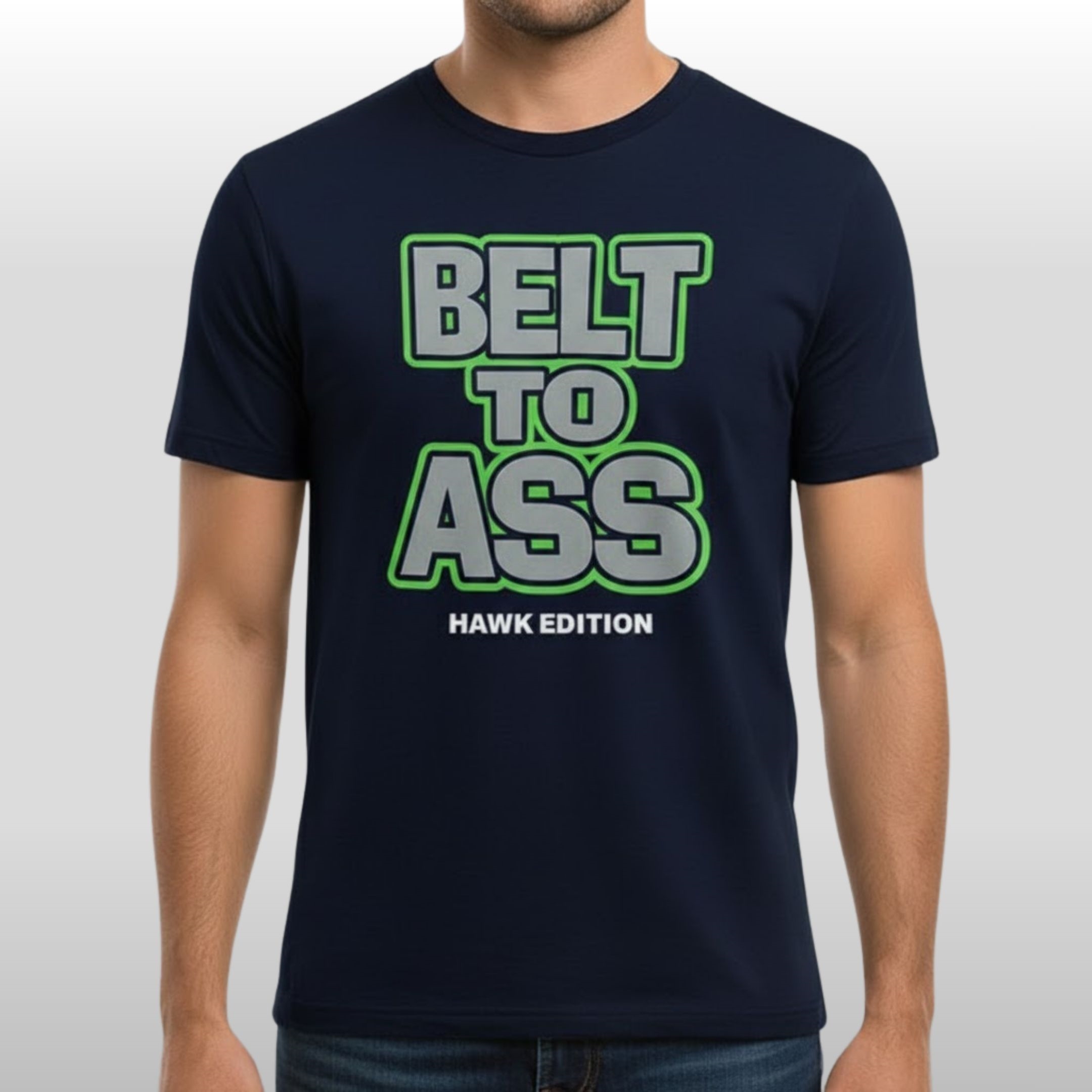 This hoodie breaks away from conventional fan gear to embrace a high-contrast, “Street-Tough” aesthetic. The front features a striking “BELT TO ASS” graphic in a layered 3D block font, utilizing a vibrant neon green outline that glows against the deep midnight navy base. Just below, the “HAWK EDITION” subtitle grounds the design, ensuring everyone knows exactly where your loyalty lies.