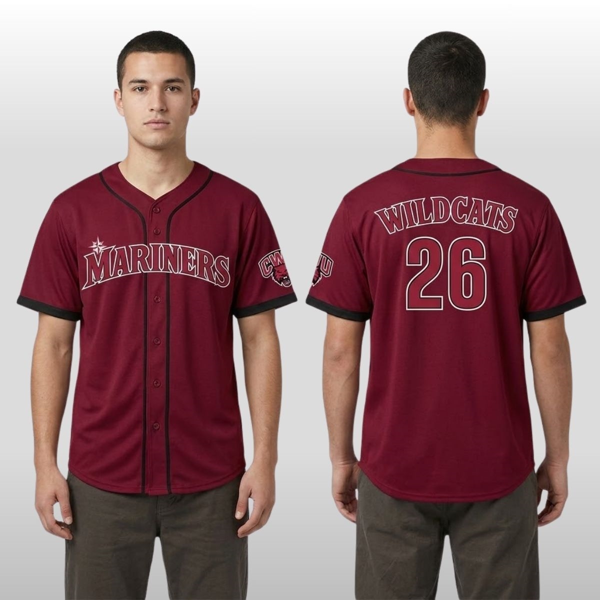 This jersey is a striking departure from the standard emerald and navy, instead adopting the bold “Wildcat Crimson” that defines the CWU identity. The front features the “MARINERS” wordmark rendered in a classic collegiate font, outlined in crisp white to stand out against the deep maroon base. Black piping runs along the neck and placket, adding a sleek, modern touch to a traditional button-down silhouette.