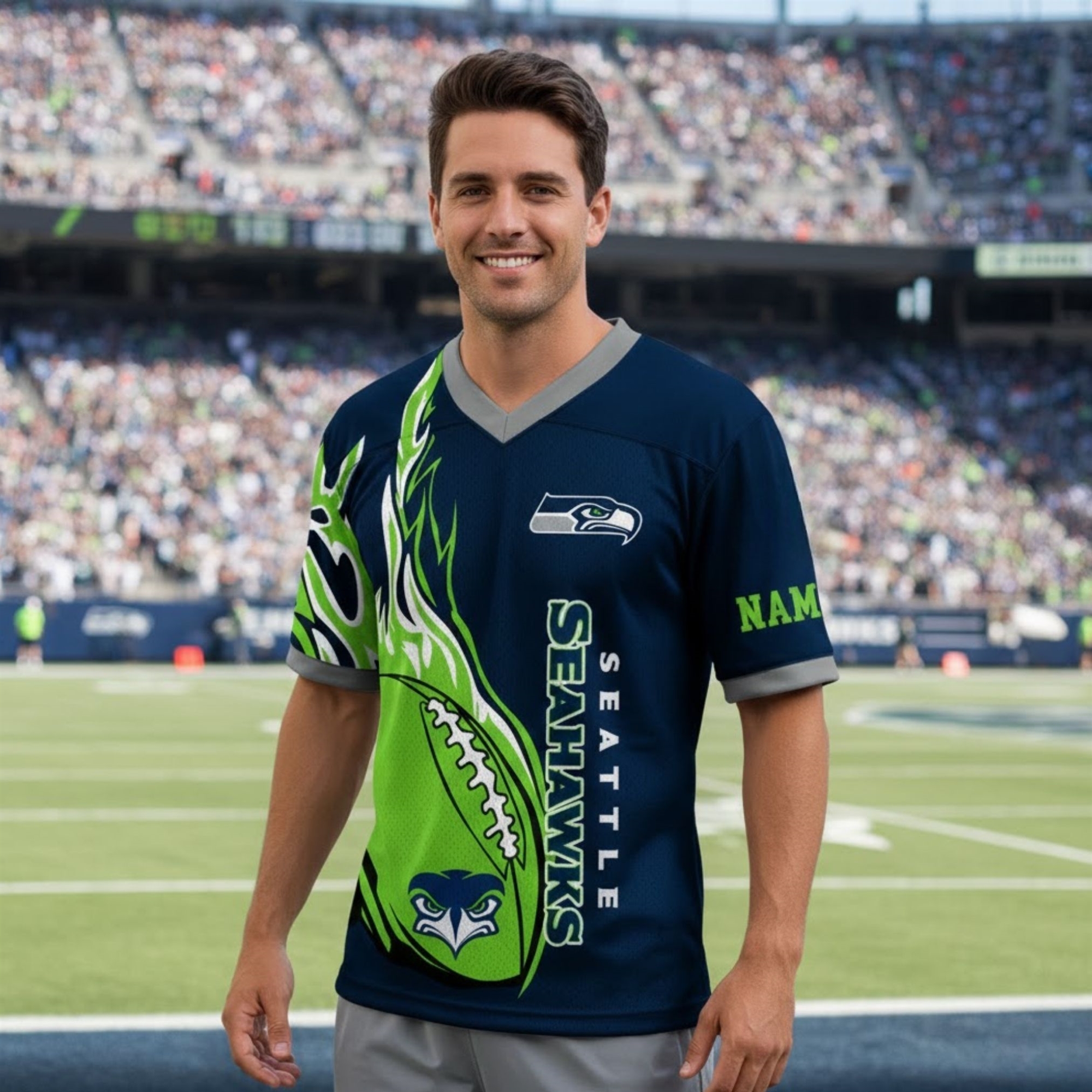 This jersey is a visual powerhouse, blending the franchise’s heritage with a high-octane aesthetic. It moves beyond standard designs to feature a striking “Action Green” flame motif that surges across a deep navy base. The front showcases a stylized football graphic integrated with the iconic hawk logo, creating a 3D effect that feels alive. With “SEATTLE SEAHAWKS” running vertically in a crisp, industrial font, the jersey demands attention from every angle.