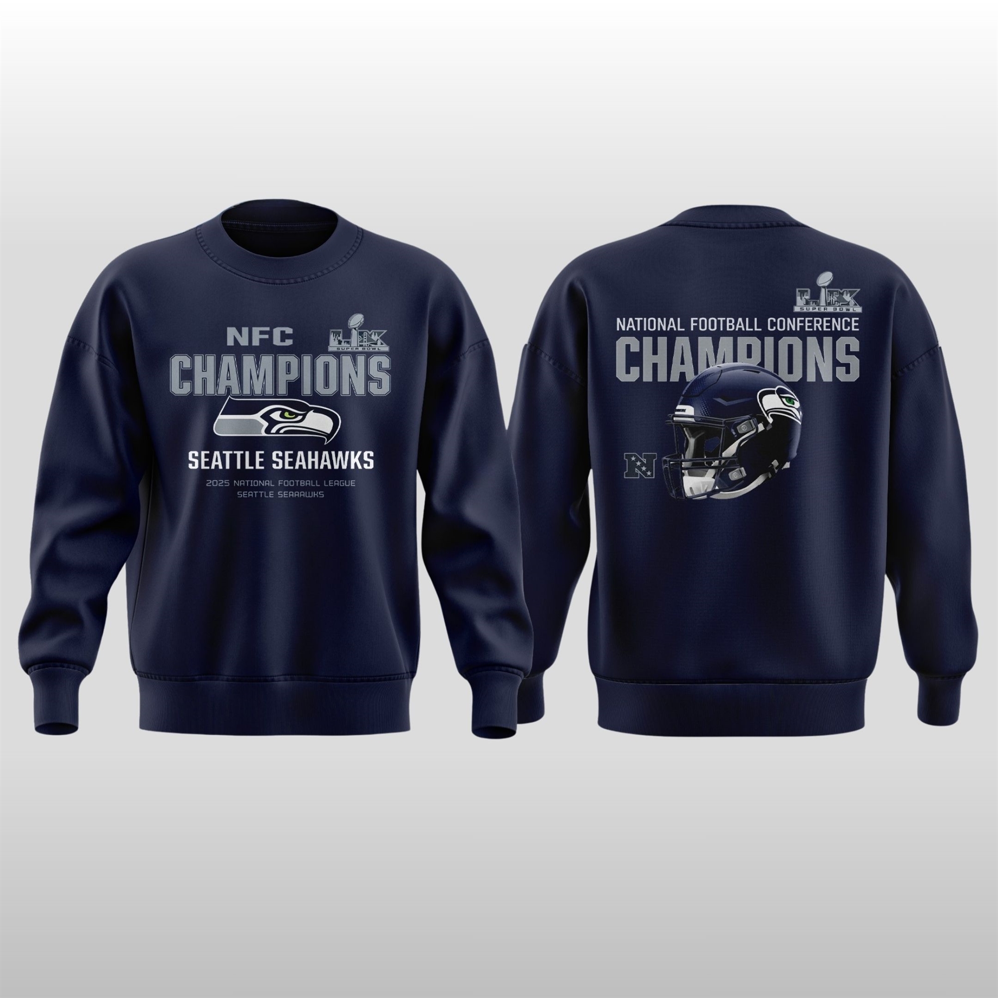This hoodie is a masterclass in commemorative design. Moving beyond standard fan gear, it features a deep midnight navy base that serves as a canvas for the bold “NFC CHAMPIONS” typography. The front display is anchored by the iconic Seahawks logo, reimagined with a metallic silver finish that reflects the prestige of the title. The sleek, minimalist layout pays homage to the team’s clinical performance throughout the playoffs while providing a versatile look for any wardrobe.
