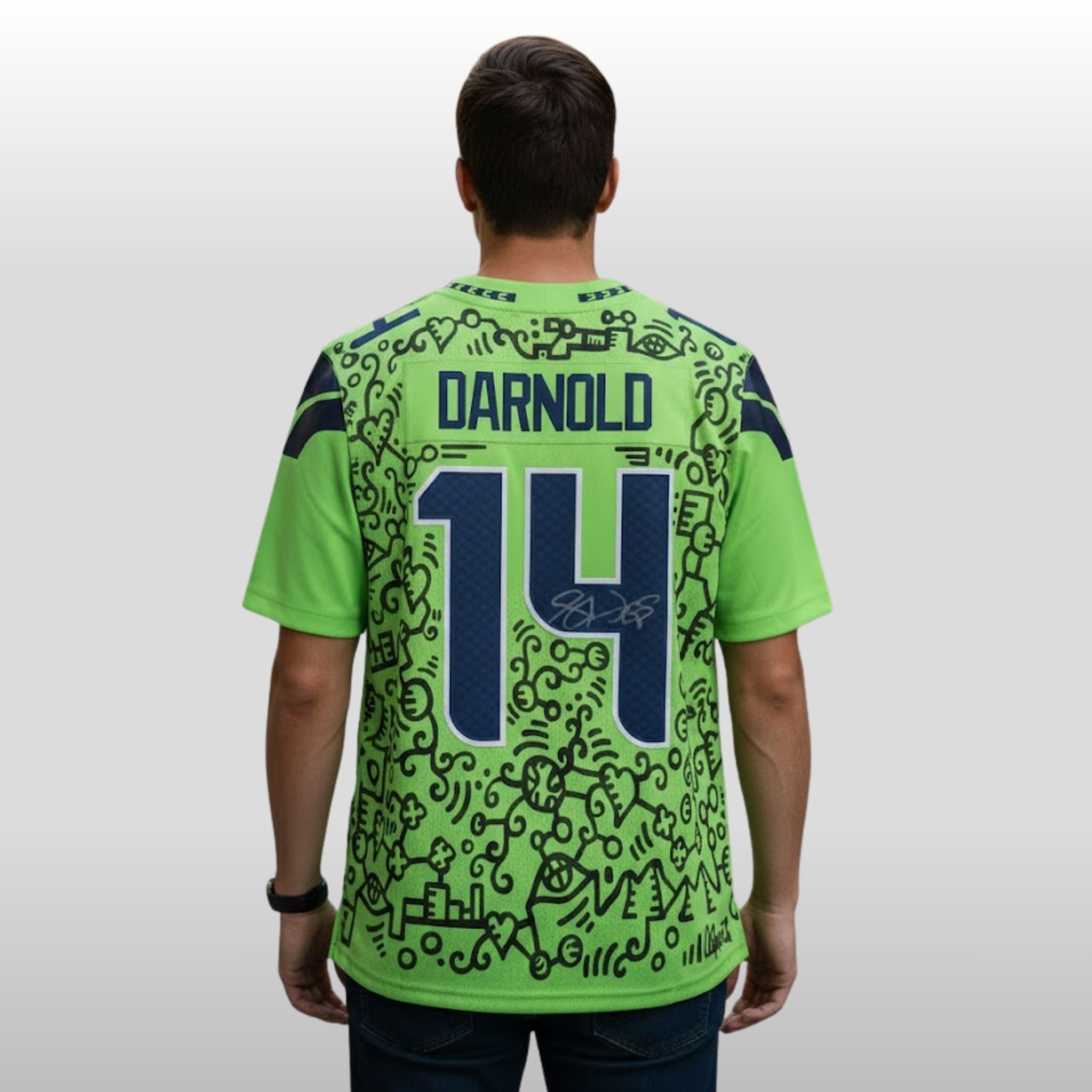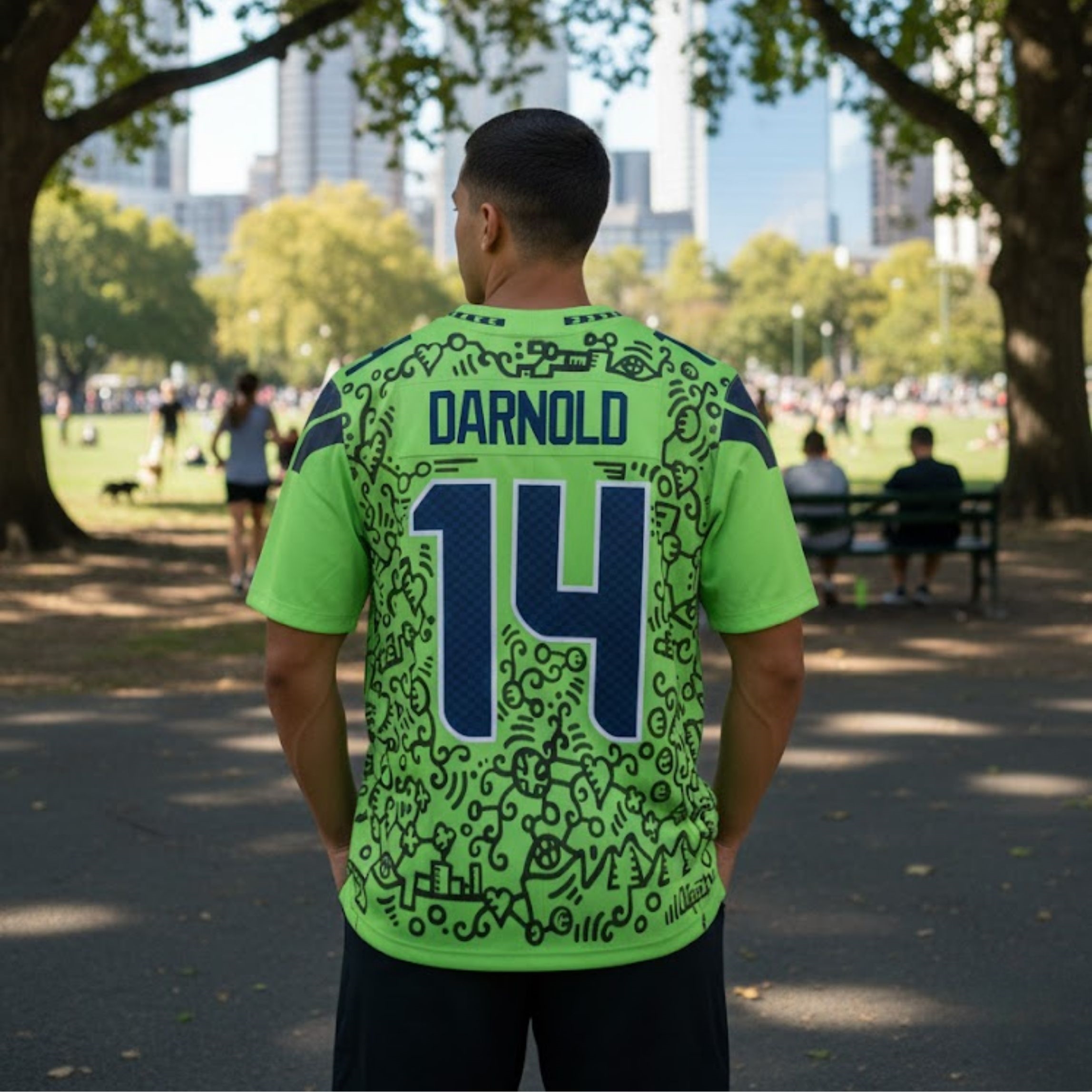On the reverse, the name “DARNOLD” and the iconic number 14 are rendered in a deep navy blue, providing a sharp, grounded contrast to the electric green patterns swirling around them. The design integrates unique textures and stylized motifs that mirror the city’s innovative spirit, making it less of a standard garment and more of a collectible piece of wearable art for the modern era.