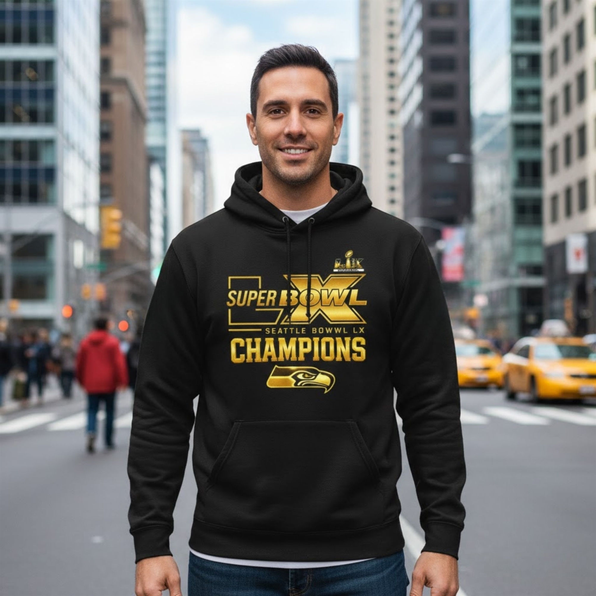 This hoodie is a masterclass in commemorative design. Moving beyond standard team colors, it embraces a high-contrast “Championship Gold” and “Midnight Black” aesthetic. The front features the bold “SUPER BOWL LX CHAMPIONS“ typography, reimagined with a 3D metallic texture that gleams against the premium dark fabric. The iconic hawk logo is rendered in a sleek golden gradient, signaling a prestigious evolution of the team’s visual identity.