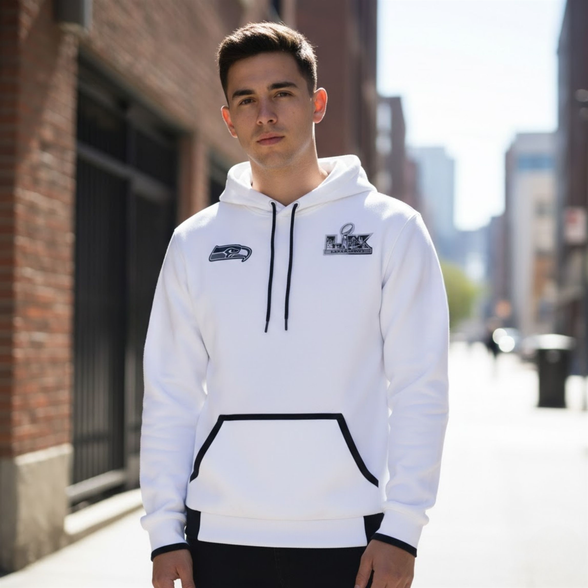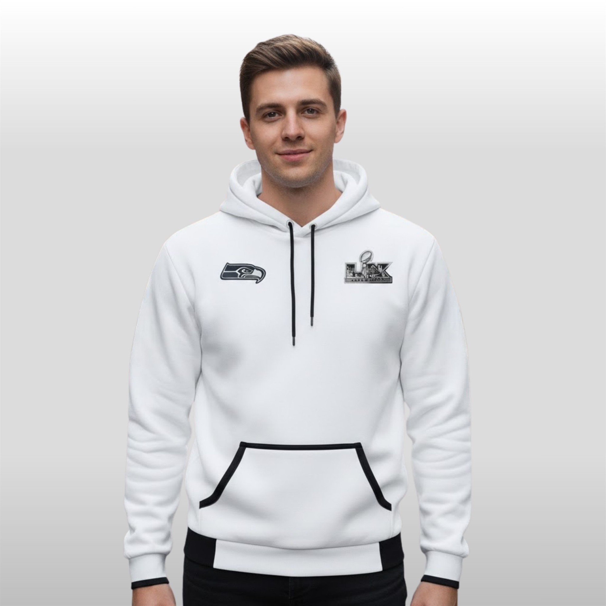This hoodie represents a sophisticated evolution in fan apparel. Moving away from the saturated “Action Green,” the design adopts a pristine “Glacier White” base that symbolizes the crisp, cool spirit of the Pacific Northwest. The front is anchored by a sleek, monochromatic Seahawks emblem on the chest, balanced by the prestigious Super Bowl LX insignia rendered in a high-definition metallic chrome finish.