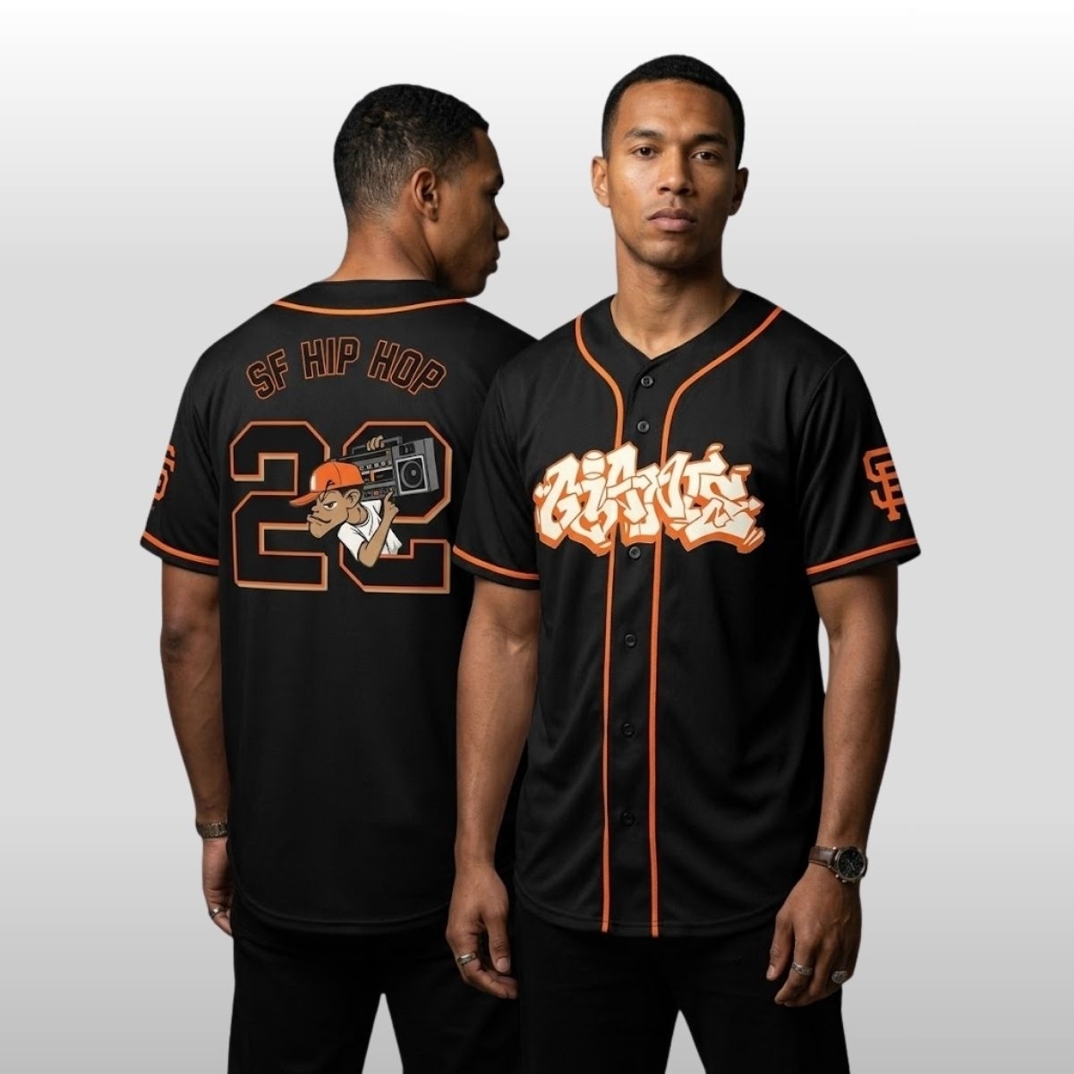 The design captures the essence of the 1990s Golden Era while remaining firmly planted in the modern day. Across the chest, the word “Giants” is reimagined in a thick, bubble-letter “wildstyle” font, outlined in a vibrant sunset orange that pops against the dark fabric. The intricate linework and drop shadows mimic the murals found throughout the Mission District, turning a standard sports silhouette into a piece of legitimate street art. On the back, a stylized character carrying a classic boombox sits alongside the number 20, symbolizing the rhythm and heartbeat of the city’s legendary neighborhoods.
