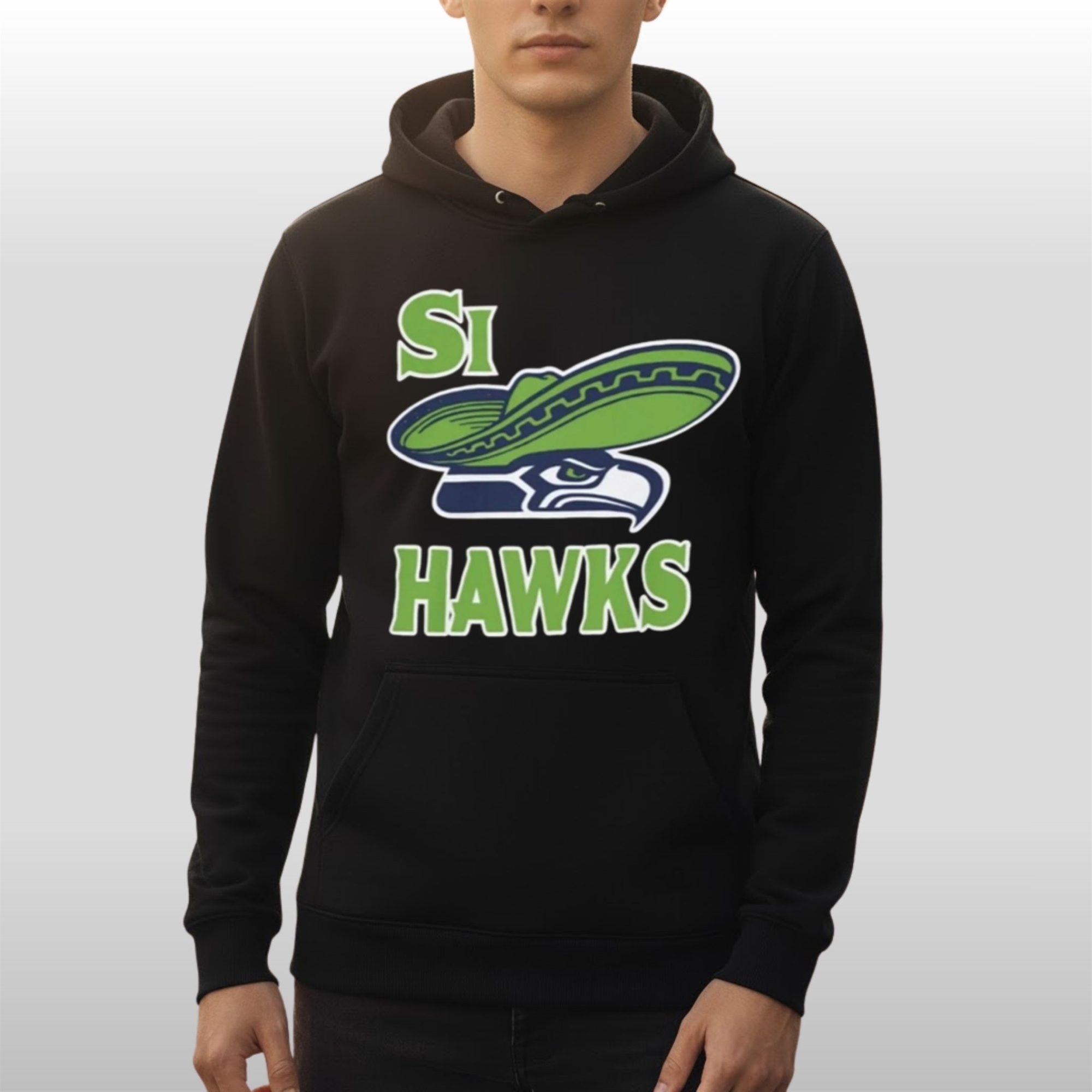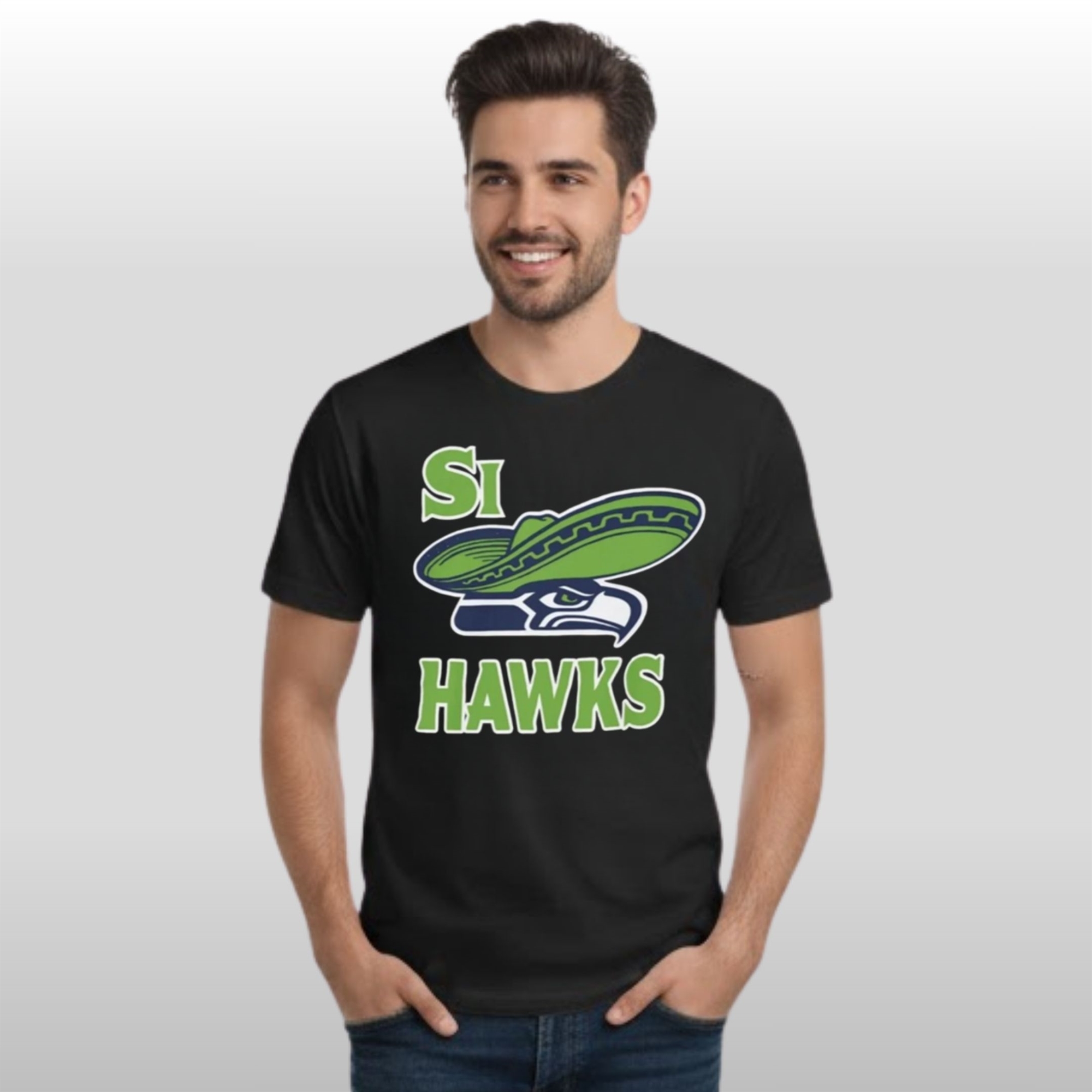 This shirt is a masterclass in cultural crossover. It breaks away from standard sports apparel to embrace a festive, vacation-ready aesthetic. The front features the iconic hawk head reimagined with a cultural twist: a bold, green-and-blue sombrero perched perfectly atop its head. Flanked by the playful “SI HAWKS” text, the design uses a striking lime green and white outline that pops against the sleek black fabric.