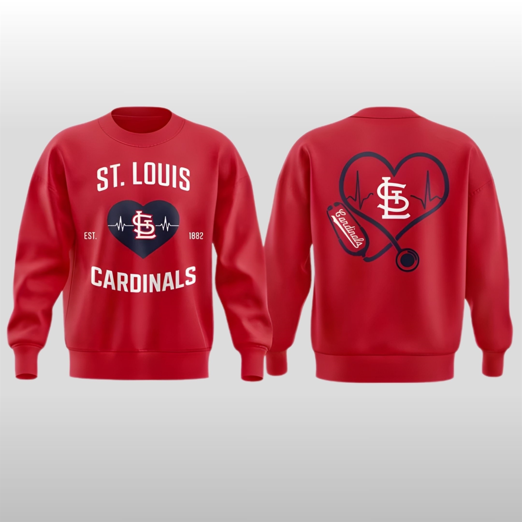 The hoodie is a masterclass in meaningful design. Staying true to the classic “Cardinals Red,” the piece integrates medical motifs directly into the team’s storied aesthetic. The front features the iconic “ST. LOUIS CARDINALS” typography framing a deep navy heart. Inside the heart, a crisp white “STL” logo is centered over a rhythmic heartbeat line, symbolizing the life-saving work of healthcare providers.