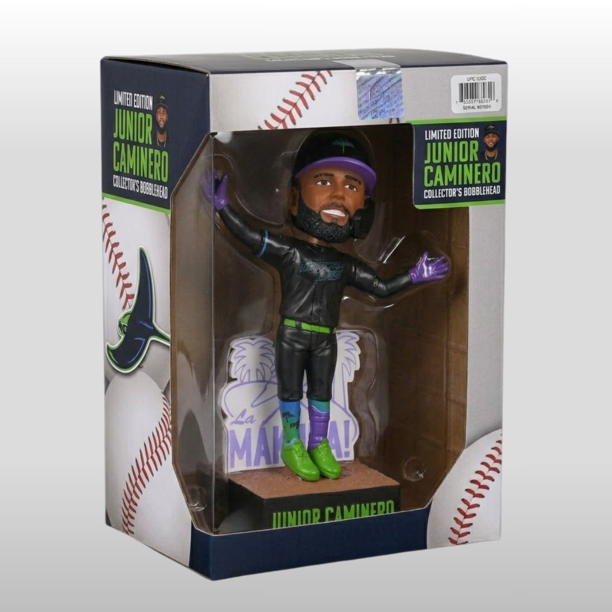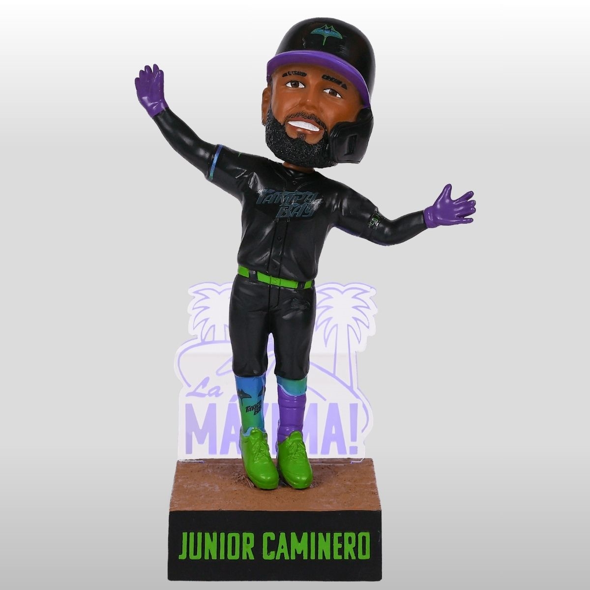 Capture the electric energy of the diamond and the rebellious spirit of the Gulf Coast with the 2026 Tampa Bay Rays Junior Caminero City Connect Bobblehead Giveaway. This limited-edition collectible commemorates the high-octane atmosphere of the mid-season “City Connect” celebration, where the team trades traditional looks for an edgy, skate-inspired aesthetic. The figure showcases Caminero in a striking black jersey featuring the “Tampa Bay” wordmark across the chest in a bold, neon-gradient font that fades from electric lime to deep purple. With his arms outstretched and gloved in vibrant purple, the bobblehead perfectly captures the youthful swagger and “Skyray” energy that defines the modern era of the franchise.
