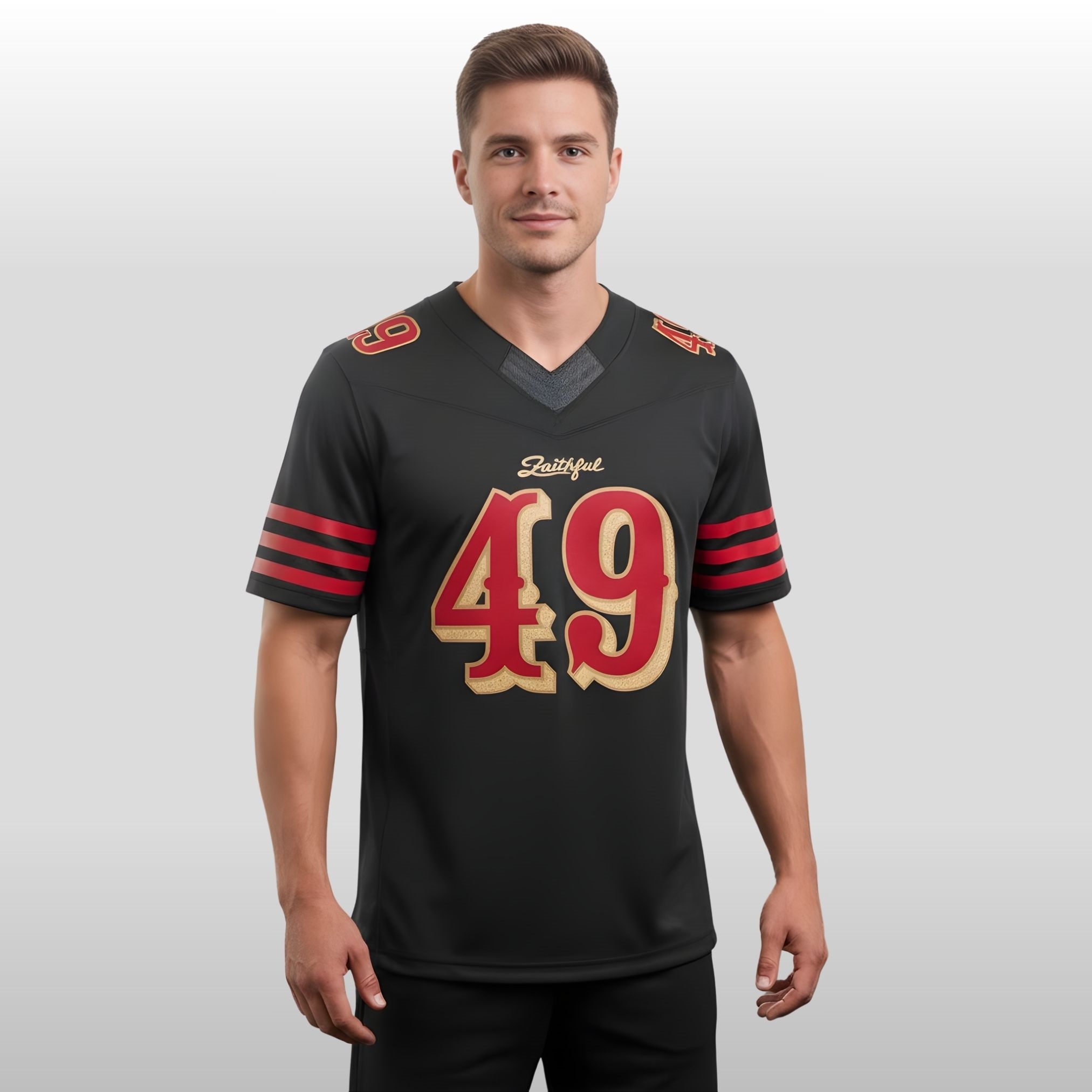 Celebrate decades of dominance with the 2026 The Faithful San Francisco 49ers Rivalries Jersey. This premium collector’s piece is designed for the ultimate supporter who lives for the intensity of high-stakes matchups. This San Francisco 49ers tribute apparel features a sleek matte black base, providing a bold backdrop for the iconic scarlet and gold-trimmed numbering.