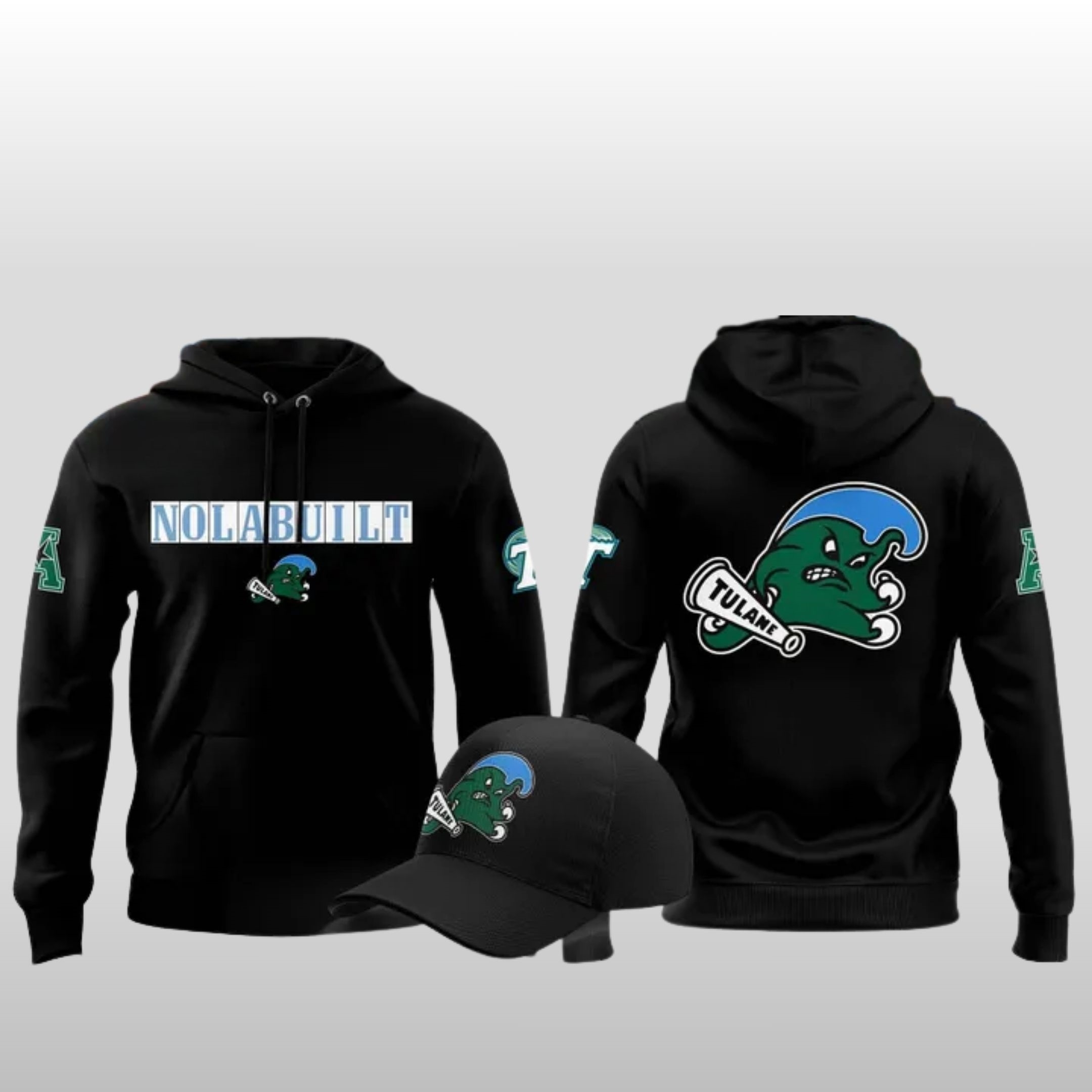 This premium black hoodie features the bold “NOLABUILT” slogan across the chest in classic sky blue and white, centered above the iconic angry wave mascot. The back showcases a high-definition, oversized graphic of the legendary wave holding a megaphone, ensuring you make an impact from every angle. This Tulane Green Wave fan gear is crafted from a heavy-duty cotton blend, offering superior warmth and durability for those breezy late-season matchups.