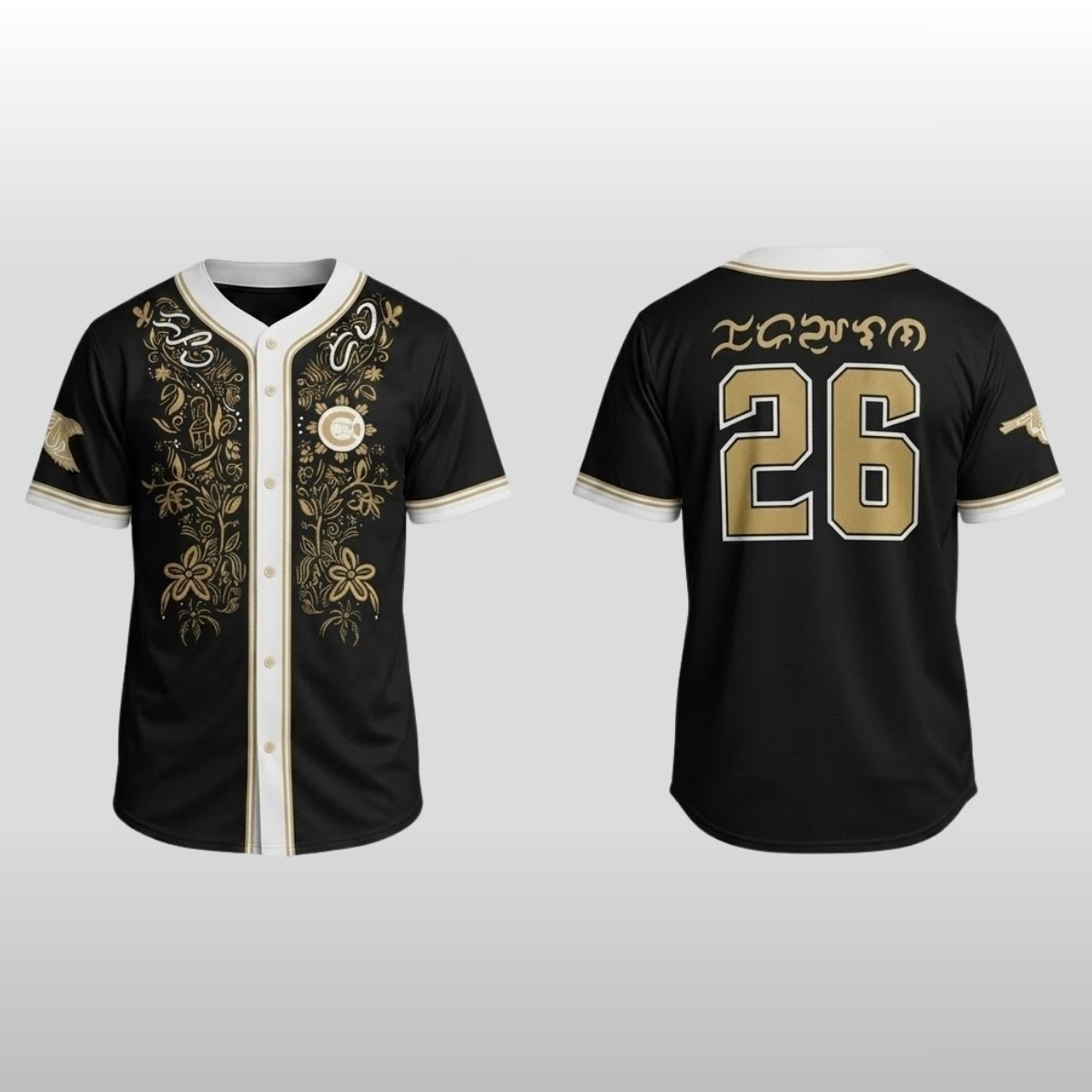 This stunning piece of apparel showcases a deep black base adorned with elaborate floral and sun-inspired embroidery that pays homage to traditional Filipino craftsmanship. The intricate gold detailing flows across the chest and shoulders, creating a luxurious contrast that feels both timeless and contemporary. With its clean white piping and classic button-down silhouette, this jersey is designed for those who appreciate a garment that tells a meaningful story while maintaining a sharp, clean appearance.