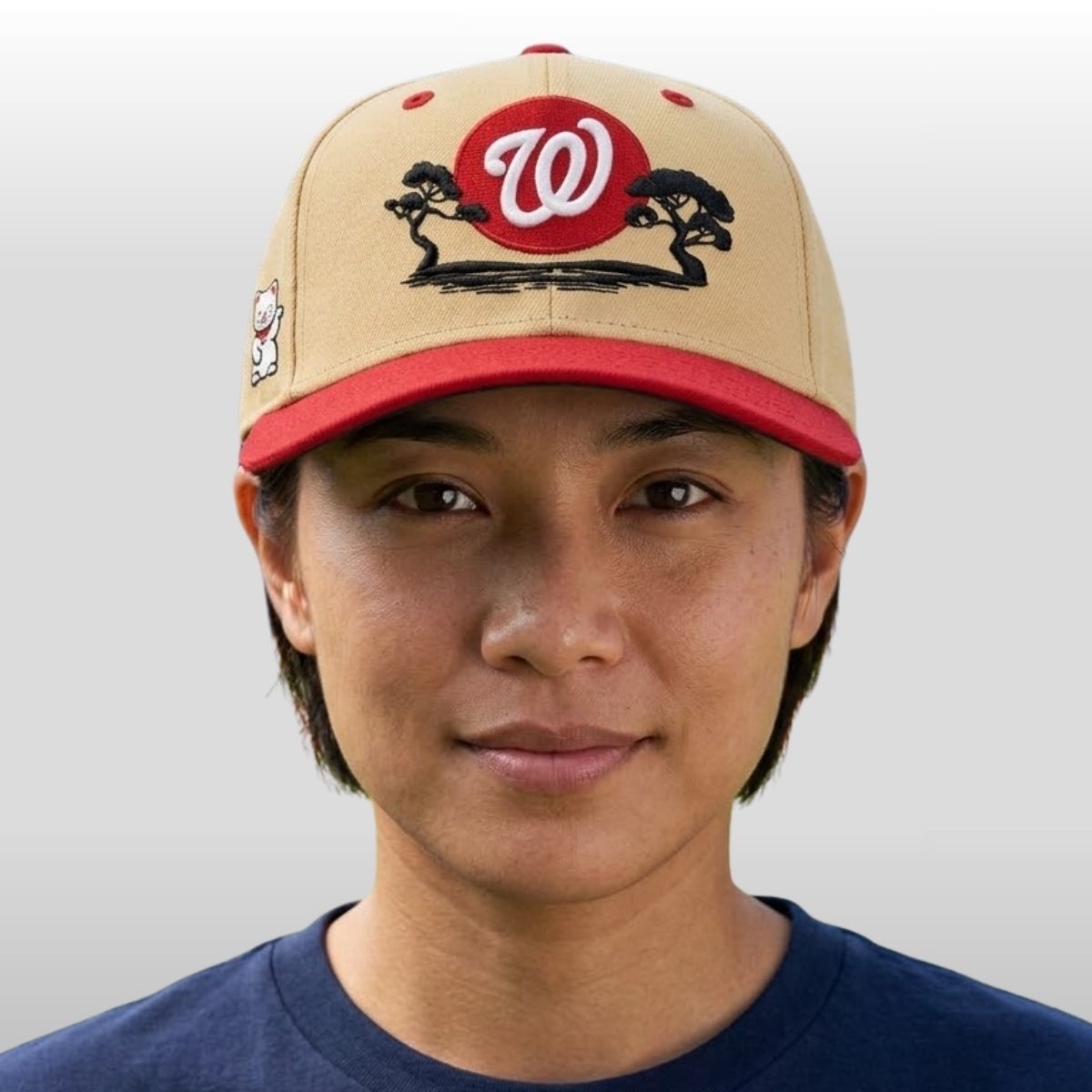This stunning piece of headwear showcases an intricate design inspired by Japanese aesthetics, featuring a serene landscape with elegant bonsai trees framing a vibrant red sun. The iconic curly “W” logo is boldly embroidered in white at the center, creating a striking contrast against the warm tan fabric. Adding a charming touch of personality, a small Maneki-neko “beckoning cat” is stitched on the side to symbolize good luck and prosperity for every fan who wears it.