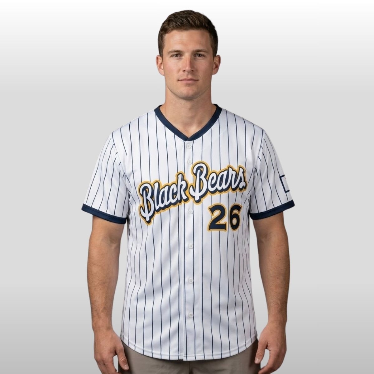 The jersey is a masterclass in local storytelling. Moving away from standard team colors, this special edition piece features a clean white base accented by traditional navy pinstripes that evoke a timeless, vintage feel. The front is anchored by the “Black Bears” script in a bold, flowing font, outlined in a striking gold that mirrors the state’s iconic sunsets.