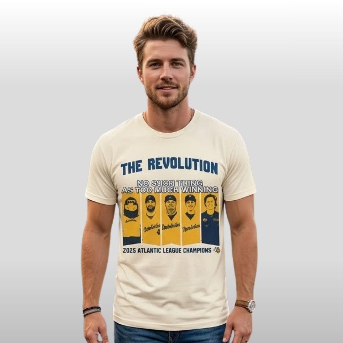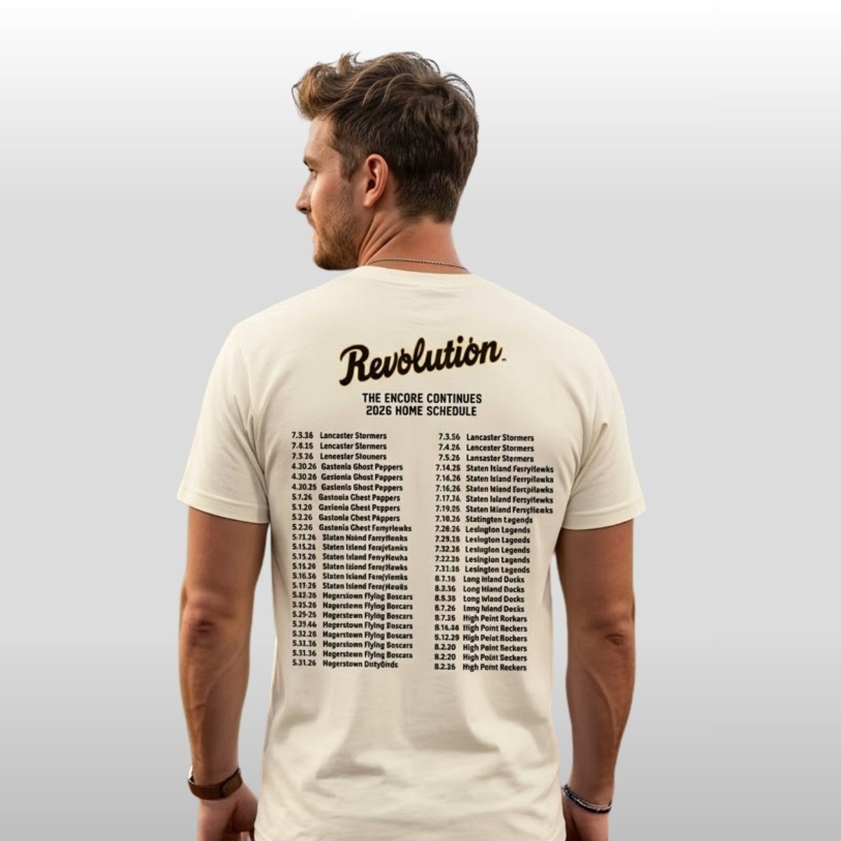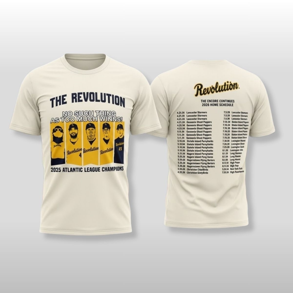 The 2026 York Revolution 2025 Championship Concert Shirt Giveaway is a masterclass in blending sports history with a rock-and-roll aesthetic. Commemorating an unforgettable season of dominance, the front of the cream-colored tee features the bold heading “THE REVOLUTION” in a classic navy blue serif font. Below it, the defiant slogan “NO SUCH THING AS TOO MUCH WINNING” sits atop a vintage-style graphic showcasing the team’s key figures and their iconic mascot. The design is grounded by the proud declaration of “2025 ATLANTIC LEAGUE CHAMPIONS.” Flipping the shirt reveals a comprehensive “2026 HOME SCHEDULE” listed under the title “The Encore Continues,” mimicking the layout of a world tour merchandise piece.