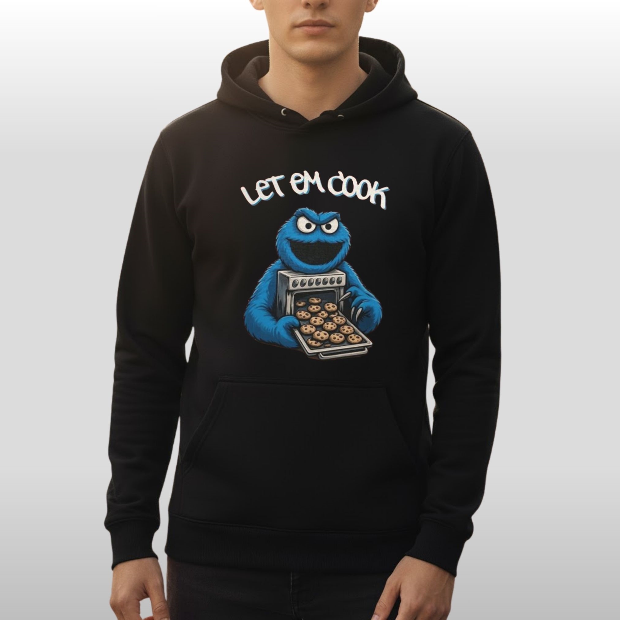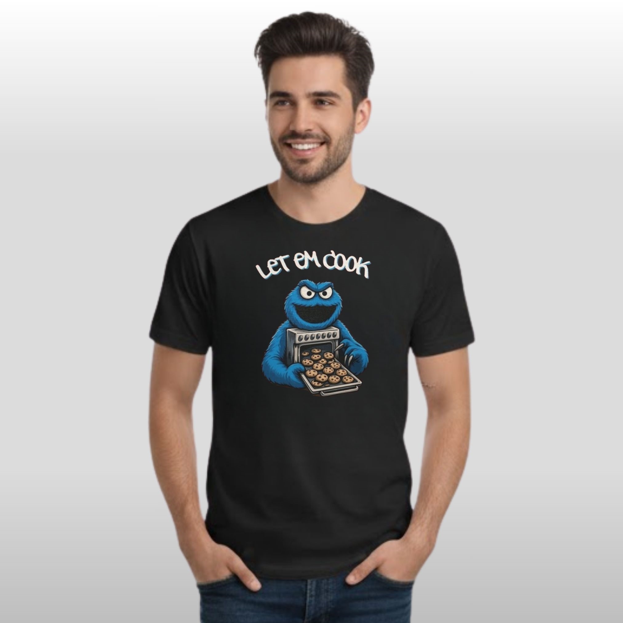 The design features a bold, blue monstrous figure—reimagined with a fierce, determined expression—pulling a fresh tray of cookies out of a glowing oven. Above the character, the iconic phrase “LET EM COOK” is rendered in a stylish, distorted font that pops against the deep black fabric. This Let Em Cook graphic tee perfectly balances humor with an edgy vibe, making it an instant conversation starter for anyone who understands the grind.