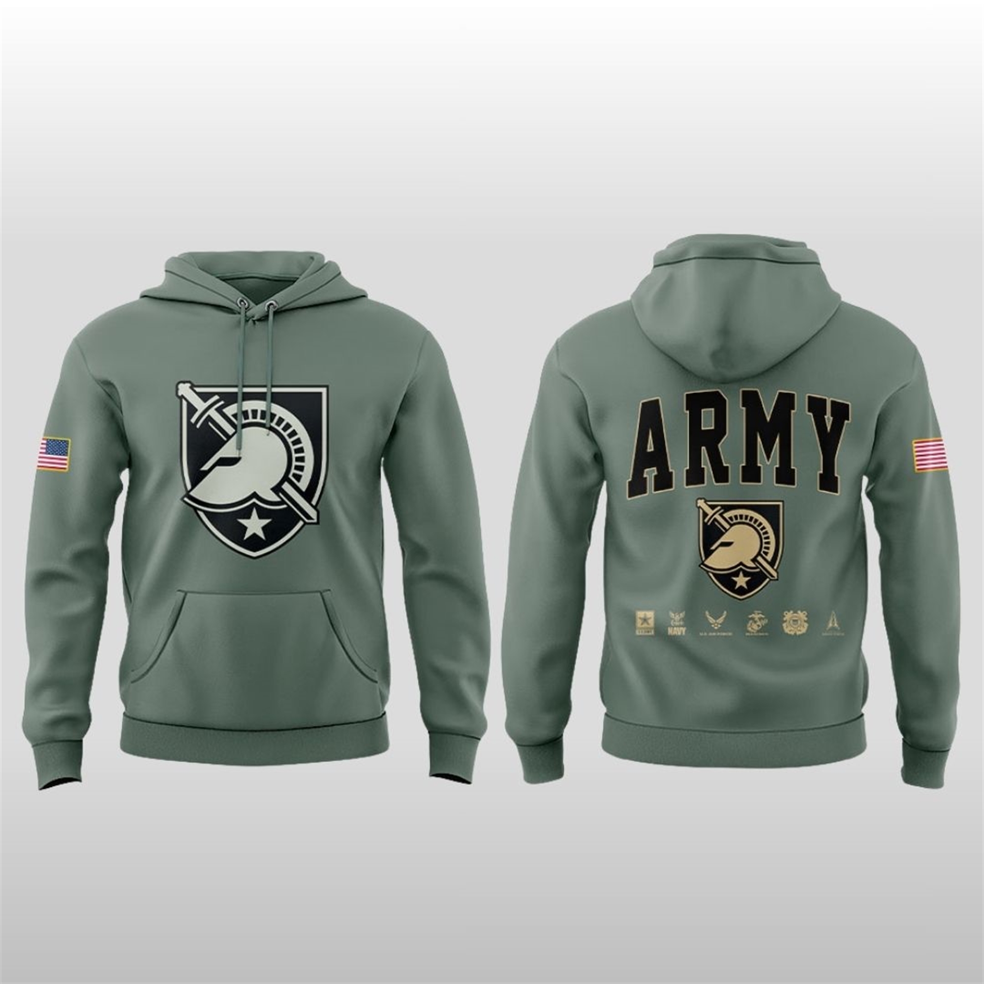 The front features a bold, centered shield graphic showcasing a Spartan helmet crossed by a sword, with a star underneath—the iconic crest representing Army‘s timeless strength and warrior ethos. A subtle American flag patch adorns the sleeve, reinforcing the patriotic connection.